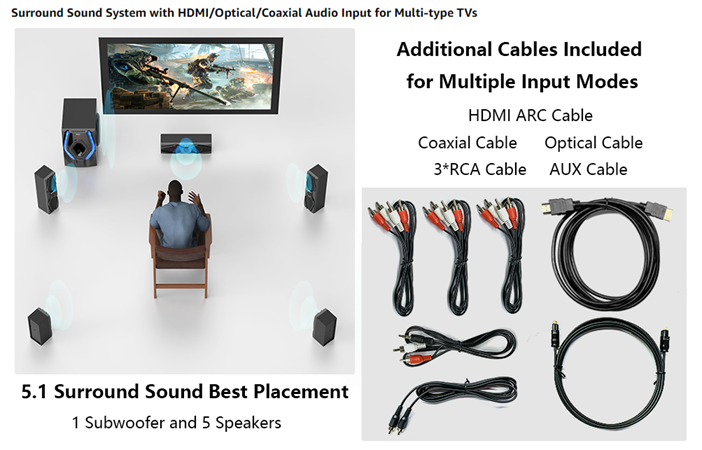 • Multimedia Support: The home surround sound speakers support various smart devices. 5.0 Bluetooth supports directly connecting with Bluetooth devices; It's also compatible with HDMI/OPT/COA/AUX/USB/DVD audio sound inputs. Additional cables include HDMI ARC Cable/Optical cable/Coaxial cable/AUX cable/RCA cable/Antenna cable supports any application in need