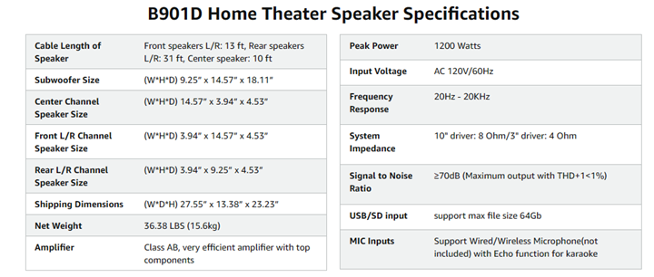 • Family Party Speakers System: The home theater system use high-quality materials and digital display function, also have FM radio function. USB drive/SD card slot(max file size 32Gb). 2 ¼” MIC Inputs with Echo function for karaoke. It's an ideal gift for family or friends.