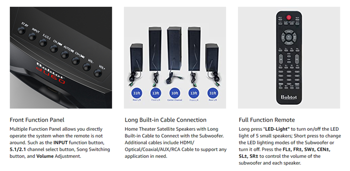 • All Function Remote: This system not only has button control via the front panel but also comes with remote control for more detailed operation. Such as via the remote, you could independently control the volume of each speaker and the subwoofer, or turn on/off the LED light.
