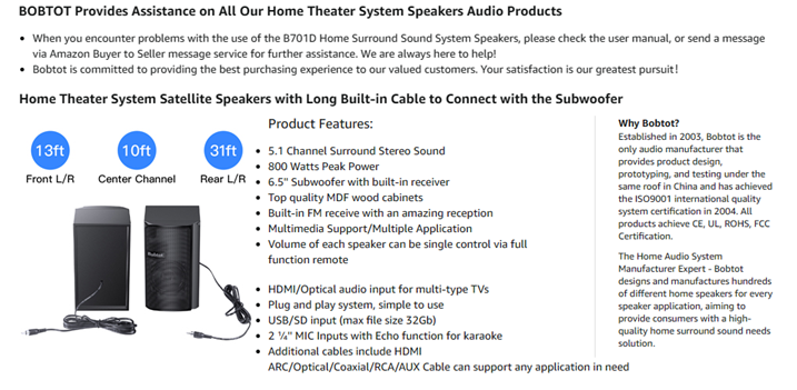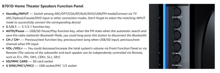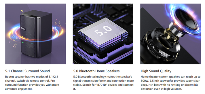 • 5.1 Channel Surround Stereo Sound: Bobtot surround sound system has two modes of 5.1/2.1 channel, switch via remote control or front panel. Pro surround function provides you with more advanced enjoyment. Via the Remote you can also independently control the volume of each speaker and the subwoofer