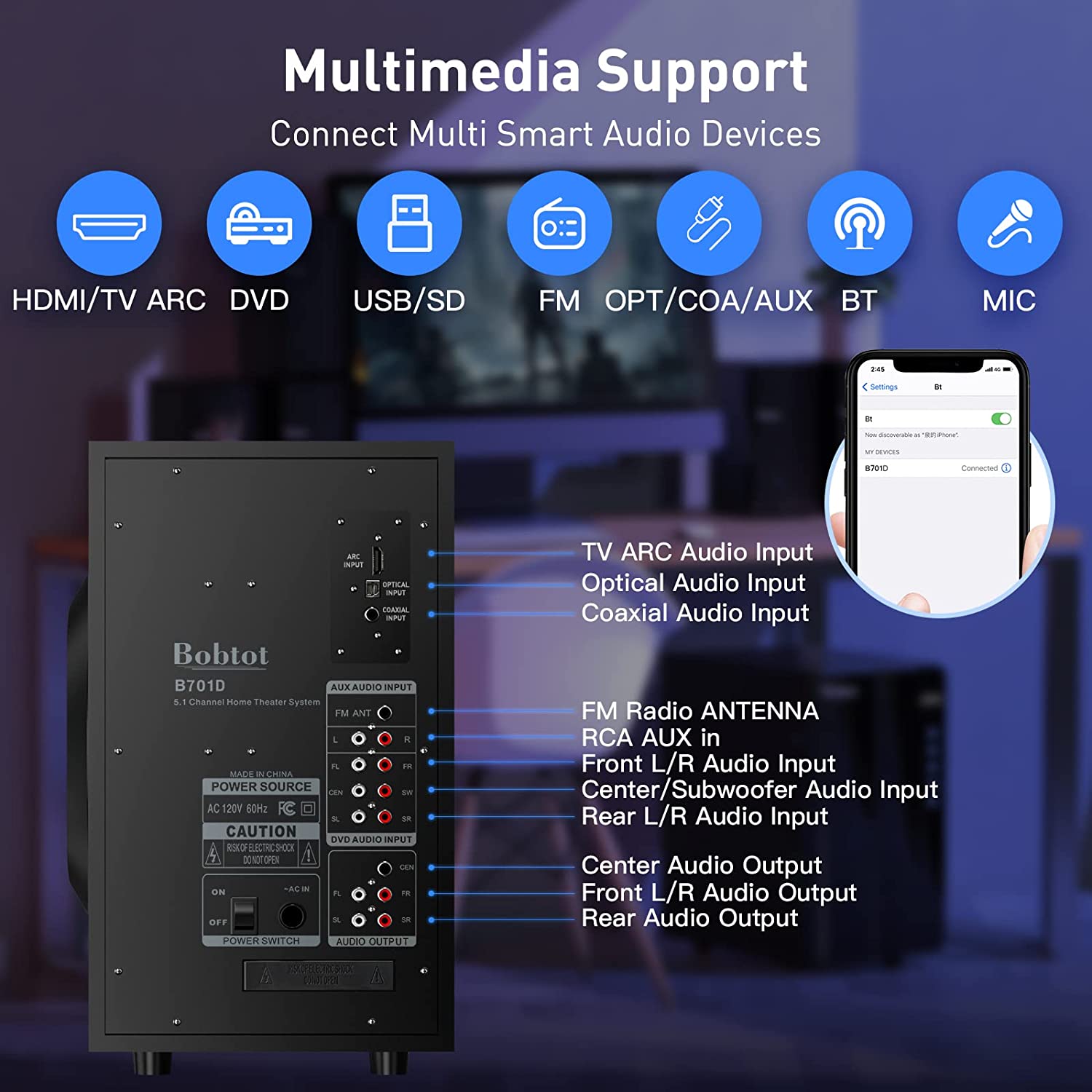 • Multimedia Support: 5.0 Bluetooth speakers can connect to various smart devices, and support multiple input modes like TV ARC/OPT/COA/AUX/USB/DVD, Additional cables include HDMI ARC cable/Optical cable/Coaxial cable/RCA cable/Antenna cable/Aux cable that can support any application in need