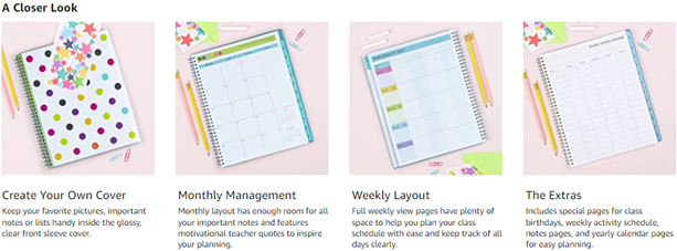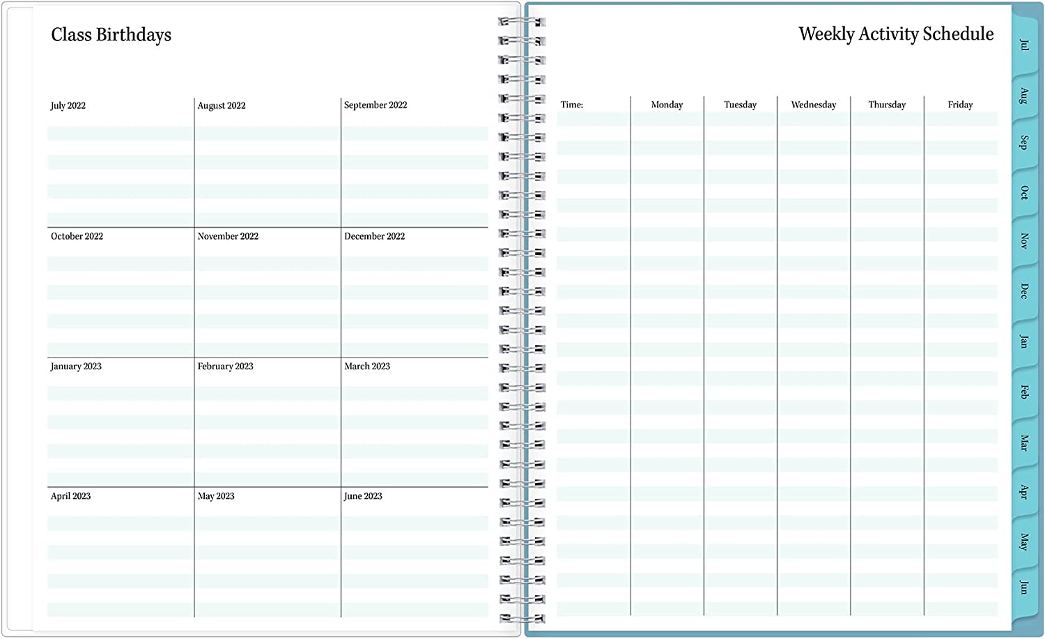 • Includes weekly lesson planning pages, a list of holidays and special dates, reference calendars, special pages for class birthdays, a weekly activity schedule and an interior storage pocket