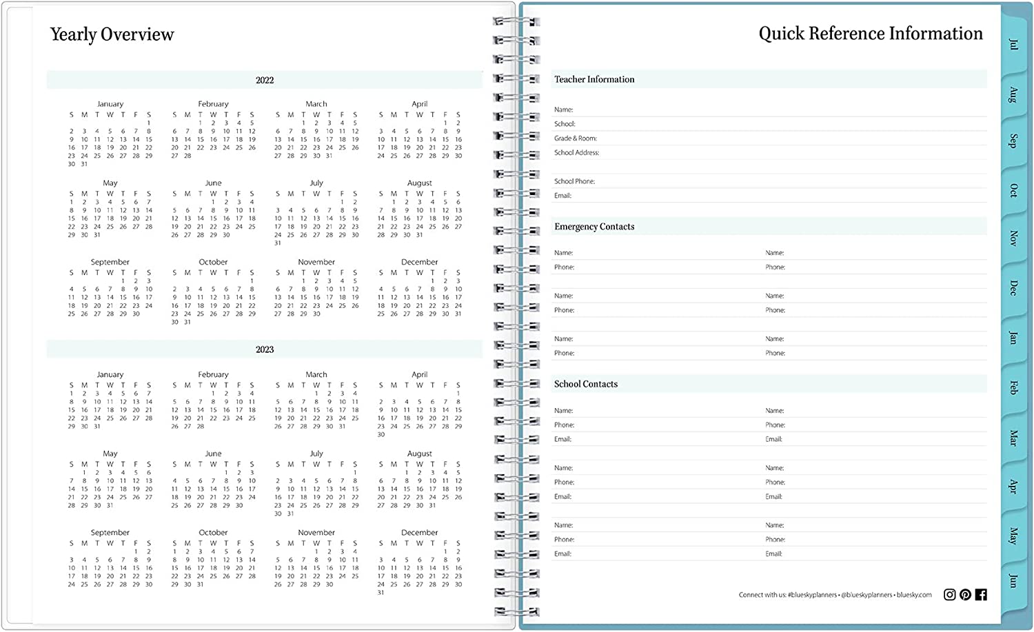 Kick off the academic year with bright, colorful designs to match your busy, colorful classroom! This colorful weekly and monthly lesson planner will help you stay on track throughout the school year with dated weekly/monthly views. Monthly two-page view features reference calendars for long-term planning, a notes section for important details, and motivational teacher quotes to inspire your planning. Weekly two-page view offers lesson planning layouts with ample writing space for detailing each day. With a class birthday tracker, weekly activity schedule pages and weekly lesson planning pages, this yearly planner offers so much more than your average planner. Insert your favorite photos inside the glossy, clear front sleeve cover for a unique planner cover. High quality white paper provides clean writing space for jotting down your appointments, to-dos and reminders. Durable coated tabbed dividers are long lasting and make accessing information a breeze. Premium quality covers and twin-wire binding provide reliable durability for daily use. An interior storage pocket makes it easy to keep pens, receipts, cards and loose notes handy. Stay on track throughout the academic year with this large 8.5 x 11 lesson planner dated July 2022 - June 2023. Mix and match with other planning products from Blue Sky to organize your daily life. Blue Sky creates modern and sophisticated organizational planners and calendars to fit the scheduling needs of busy people - whether it’s for business professionals, college students, teachers, or anyone with appointments to make note of. Keep your life organized with our full line of products including desk pad calendars, wirebound tabbed weekly and monthly planners with contacts and notes pages to accommodate your scheduling needs, and laminated two-sided wall calendars, all in a variety of colors and patterns to suit your lifestyle and personality.