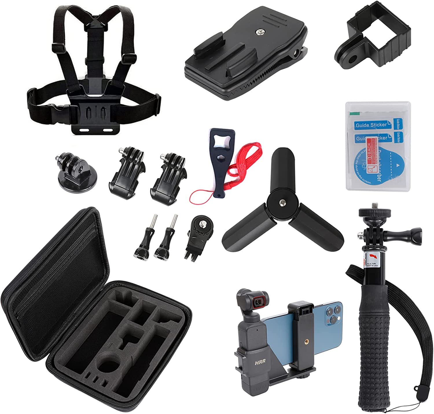 • For Osmo Pocket/Pocket 2 ,includes 1 X Portable Carry Case,1 X Chest Harness,1 X Selfie Stick,1 X Tripod,1 X Handheld Phone Holder,1 X Tripod Mount Adapter,1 X 360 Degree Rotation Backpack Clip,1 X Tempered Glass Screen Protector,1 X Extended Border,2 X J hook,2 X Screw,1 X 1/4’ Conversion adapter