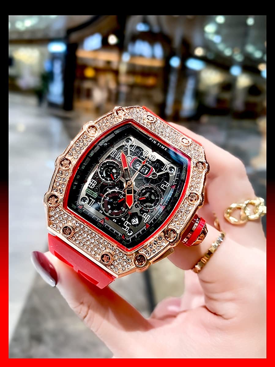 ❤️️ Fashion Unique Design ❤️️ : Big face luxury watch for men, 44mm diameter Domineering oak barrel case accommodate the chronograph sub-dial, calendar window below 5 o'clock, Shiny iced-out bezel , Making the watch design more vibrant. Suitable for many indoor & outdoor scenes.