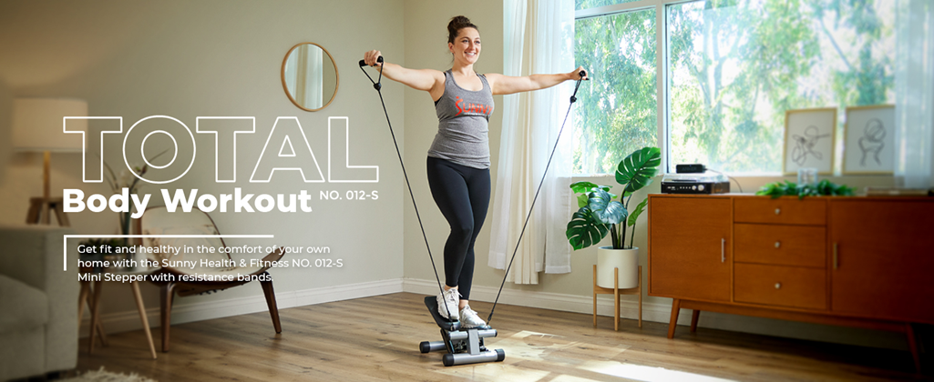 Get fit and healthy in the comfort of your own home with the Sunny Health & Fitness Mini Stepper with resistance bands. Offering a full cardio workout and strengthening your muscles, this stepper exercise machine can help you get a shapely and toned body as well as a full-body workout. Work out anywhere at any time! This stepper with removable resistance bands is easily assembled, simply unbox and attach the included resistance bands to begin your fitness journey! Convenient easy-assembly means you can save time, money, and energy on putting together your stepper!