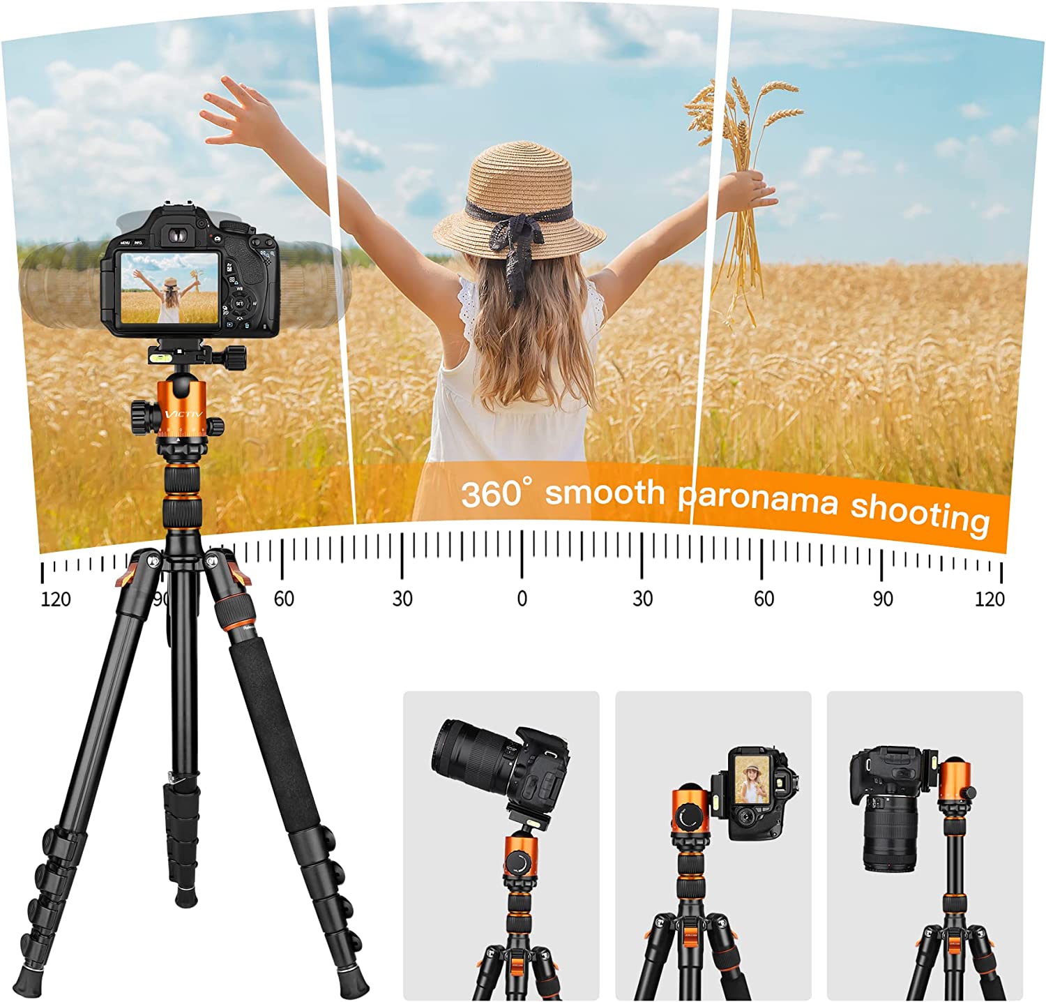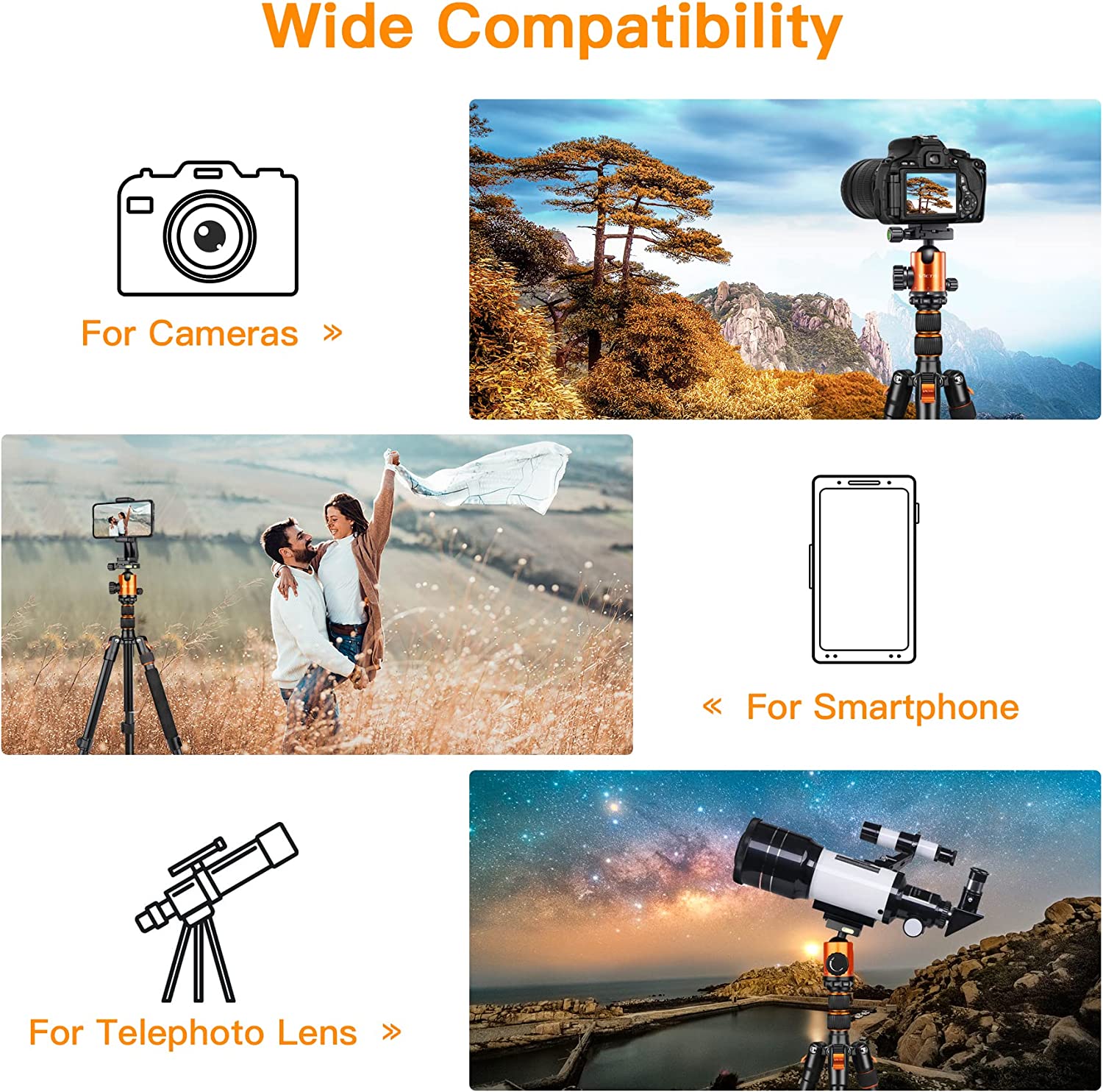 • 【High Quality & Flexible Design】 Made of aluminum alloy, light but strong tripod is with 3 built-in bubble levels and 2 quick release plats. 36mm ALUMINUM ball head that can rotate freely 360 degrees has strong wear and corrosion resistance. It provides a comfortable shooting experience and BETTER EQUIPMENT GUARANTEE each time