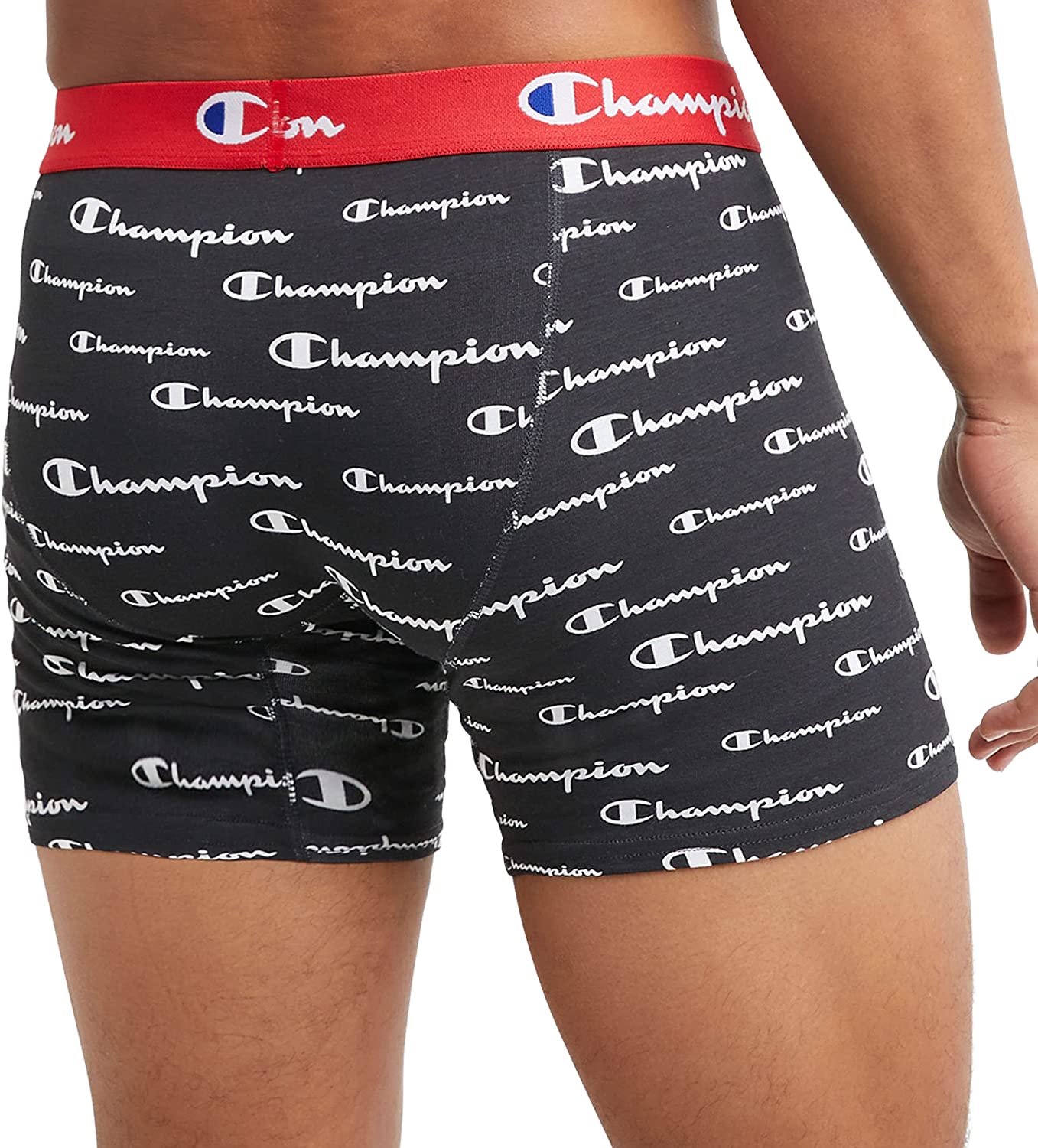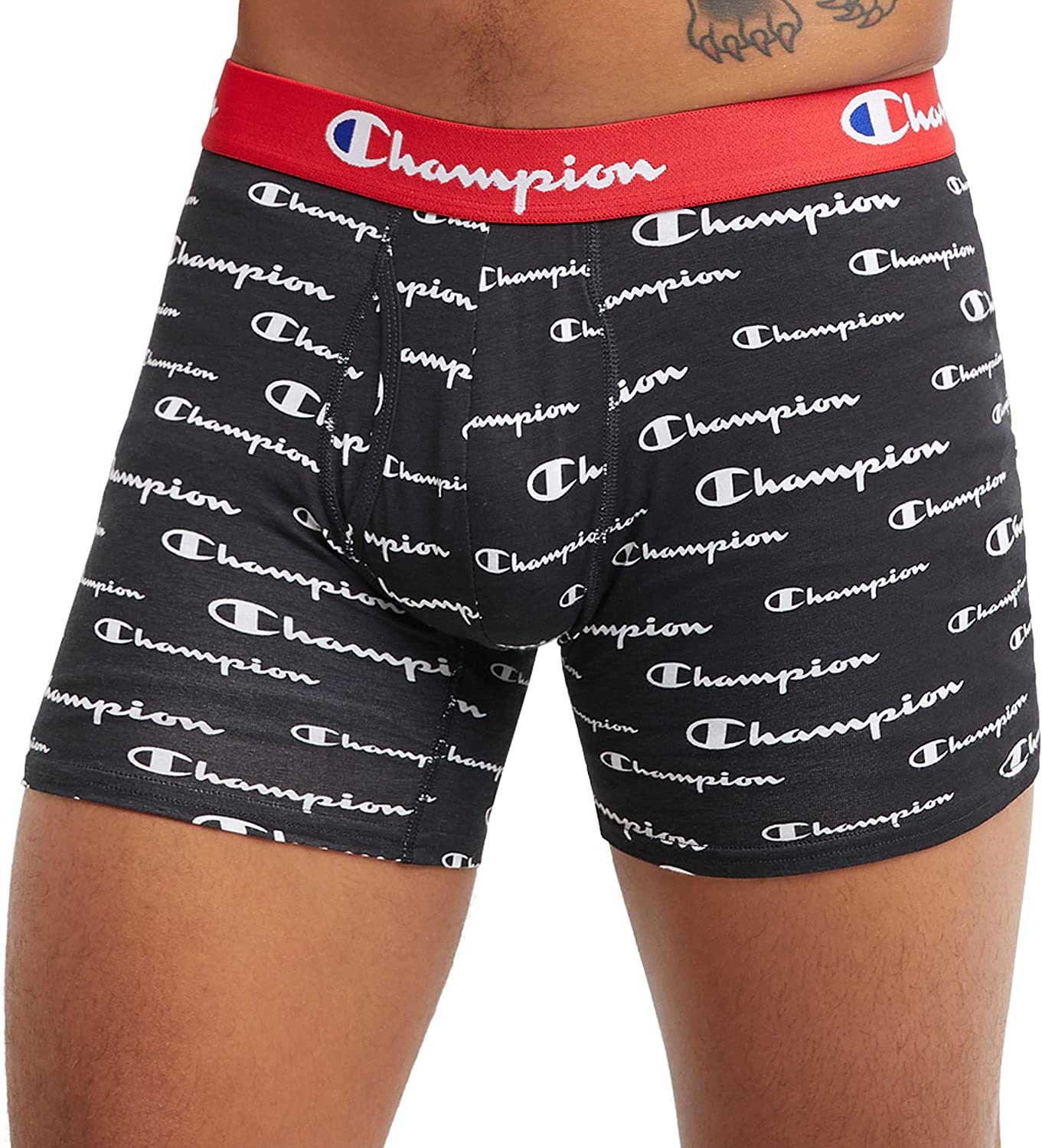 95% Cotton, 5% Spandex   Imported  Pull On closure  Machine Wash  VALUE PACK - Get more bang for the buck when you buy a trunks for men pack featuring 3 pairs of men’s cotton trunks with contrasting branded waistbands.  STRETCH SUPPORT - Boxer brief underwear is made from a blend of polyester and spandex for just the right stretch and light compressive support.  MOISTURE MANAGEMENT - Stay fresher and drier with moisture-wicking men’s underwear.  CONTROL THE ODER - Made of fabric treated to resist odor-causing bacteria, cotton boxer briefs stay fresher for all-day confidence SAY NO TO RIDE UPS - A stay-put fit featuring hemmed legs means you won’t worry about annoying ride-ups when you’re wearing these comfortable boxer briefs. NO CHAFE ZONE - Smooth, flat seams and a soft, elastic waistband combat irritation in this anti-chafing underwear for men. SAY YES TO FRESH - Cooling fabric is treated to resist odor-causing bacteria for all-day confidence. CLASSIC CHAMPION - Show your Champion pride. These boxer briefs feature a repeating script logo on contrasting waistbands. MESH POUCH - Mesh pouch provides advanced support where you need it the most. COLD WATER WASH - Champion recommends machine washing this product in cold water to help reduce energy usage. Show more