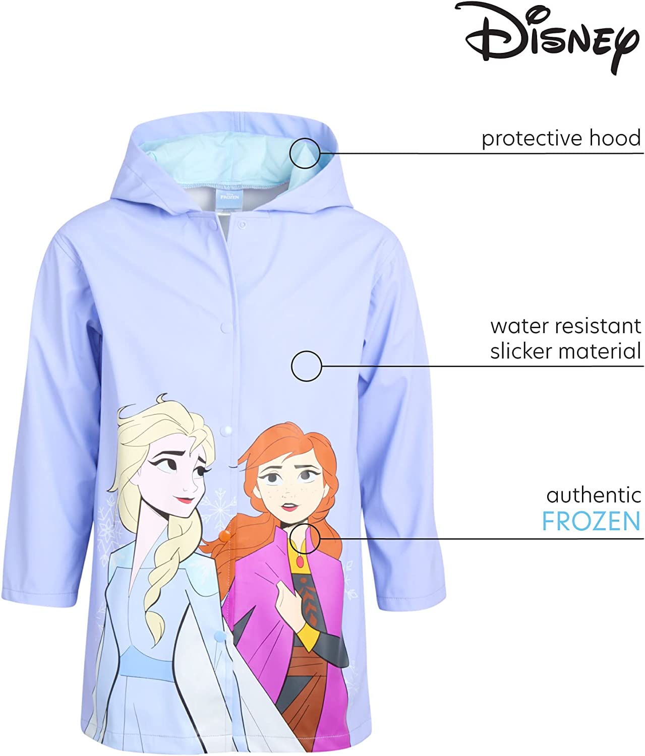 • GIRLS' DISNEY RAINCOAT: This multipurpose and versatile Disney raincoat is a must-have for your baby girl that will help her stay safe from the elements when the weather changes suddenly; Perfect jacket for all little fans of the Disney cartoons and characters, featuring a big and vibrant Minnie Mouse print or Frozen princesses, Elsa and Anna