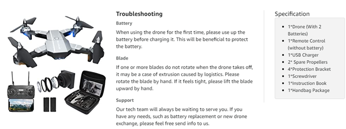 It also has many fantastic functions, including 3D Flip / Altitude Hold / Headless Mode / Follow me Mode / Waypoints Fly / Gravity Control / One Key Return and so on.You can have a lot of fun by flying the drone.