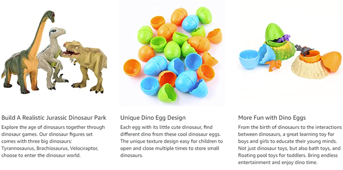 • 【Build Kids Dinosaur World】Dino toy set contains 3 large dinosaurs(Tyrannosaurus, Brachiosaurus, Velociraptor), 18 dinosaur eggs, 18 adorable random dinosaur babies and 6 dinosaur egg slots. Cute dinosaur toys stimulate children's interest to build their own dinosaur world, discover different mini dinosaurs from dino eggs and learn the animal hatching process