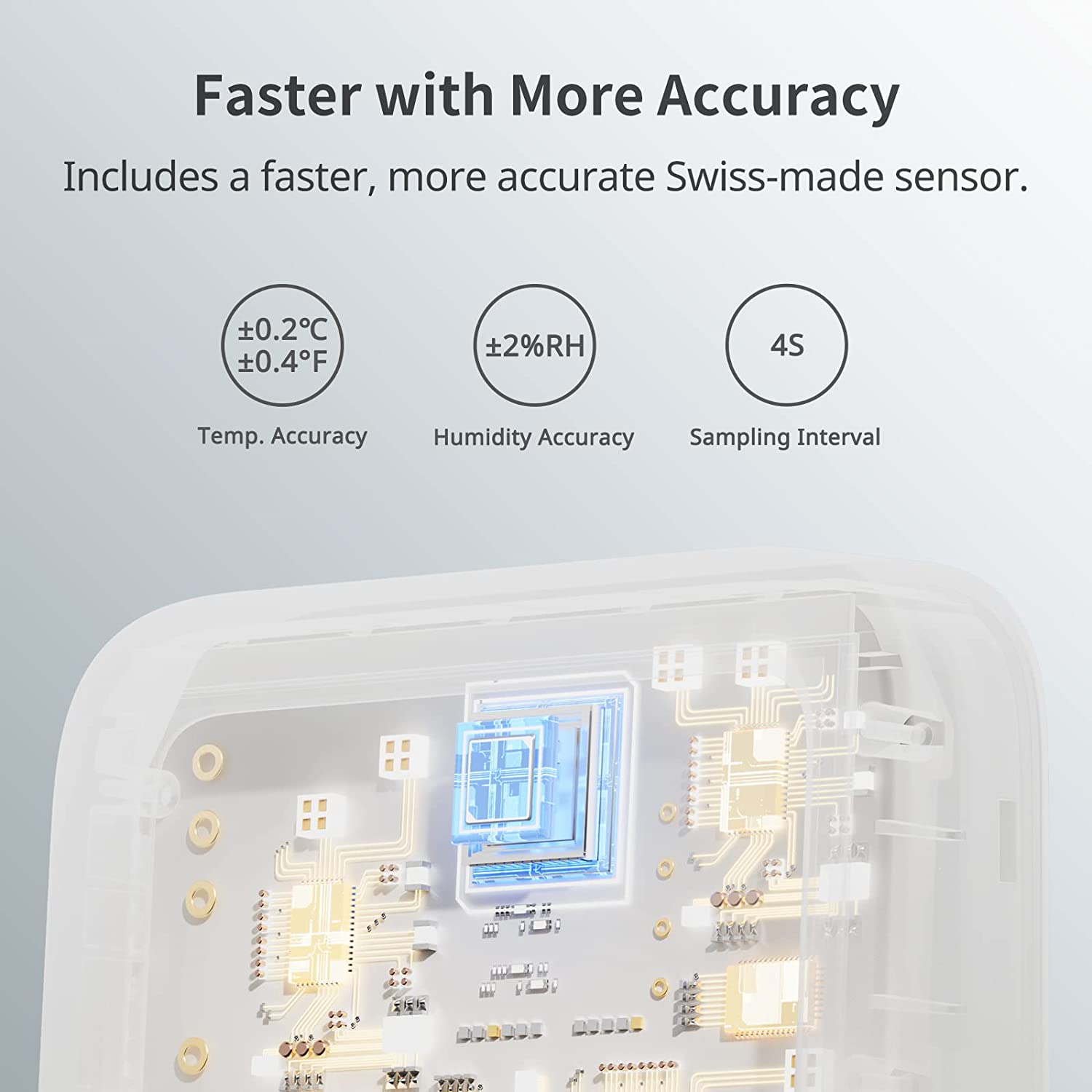 More Accurate Readings - Our indoor thermometer includes a built-in Swiss-made sensor that gives you more accurate temperature and humidity readings in both Celsius and Fahrenheit. It monitors the environment reliably every 4 seconds, maintaining ±0.2°C/±0.4°F accuracy in temperature -20°C~80°C (-4°F~176°F) and ±2%RH accuracy in humidity 0~99%RH.
