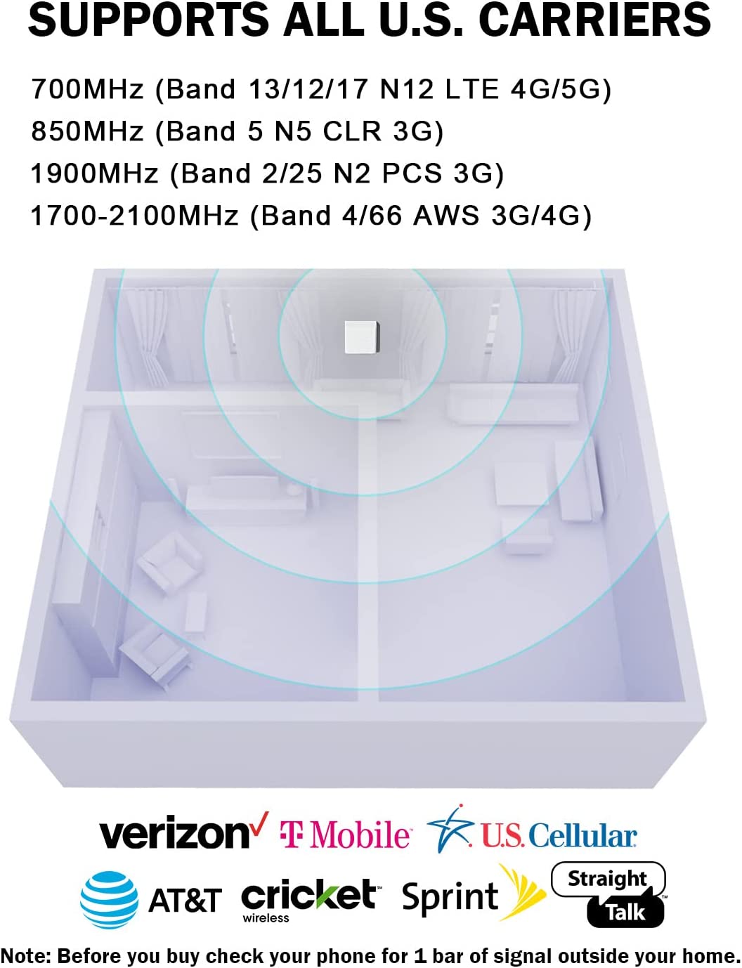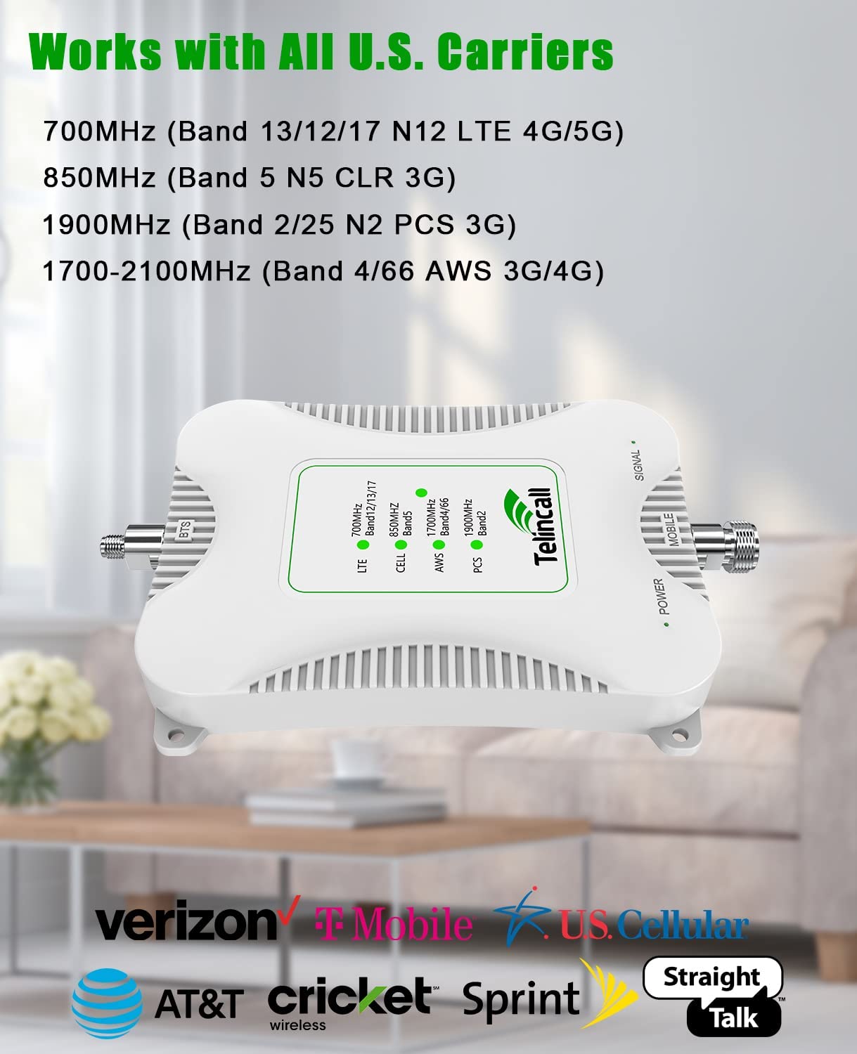 • Cell booster for home works for Verizon, AT&T, Sprint, Straight Talk, T-Mobile, U.S. Cellular. Cell signal booster for home is professional designed for 700MHz Band 13/12/17 4G LTE 850/1900MHz 3G PCS 1700/2100Mhz Band 4 AWS Band 2/5/25 5G N2/N5/N12.