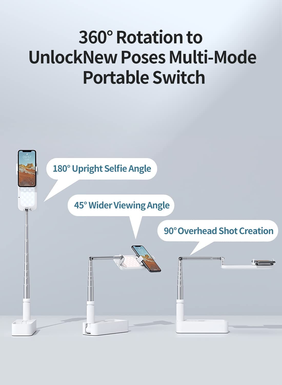 yAyusi Phone Stand for Recording,360° Rotation with Selfie Stands and Phone Holders,Overhead Phone Mount,1000mAh Battery Operated 7 Brightness LED Light for Live Streaming/Video Recording (White)