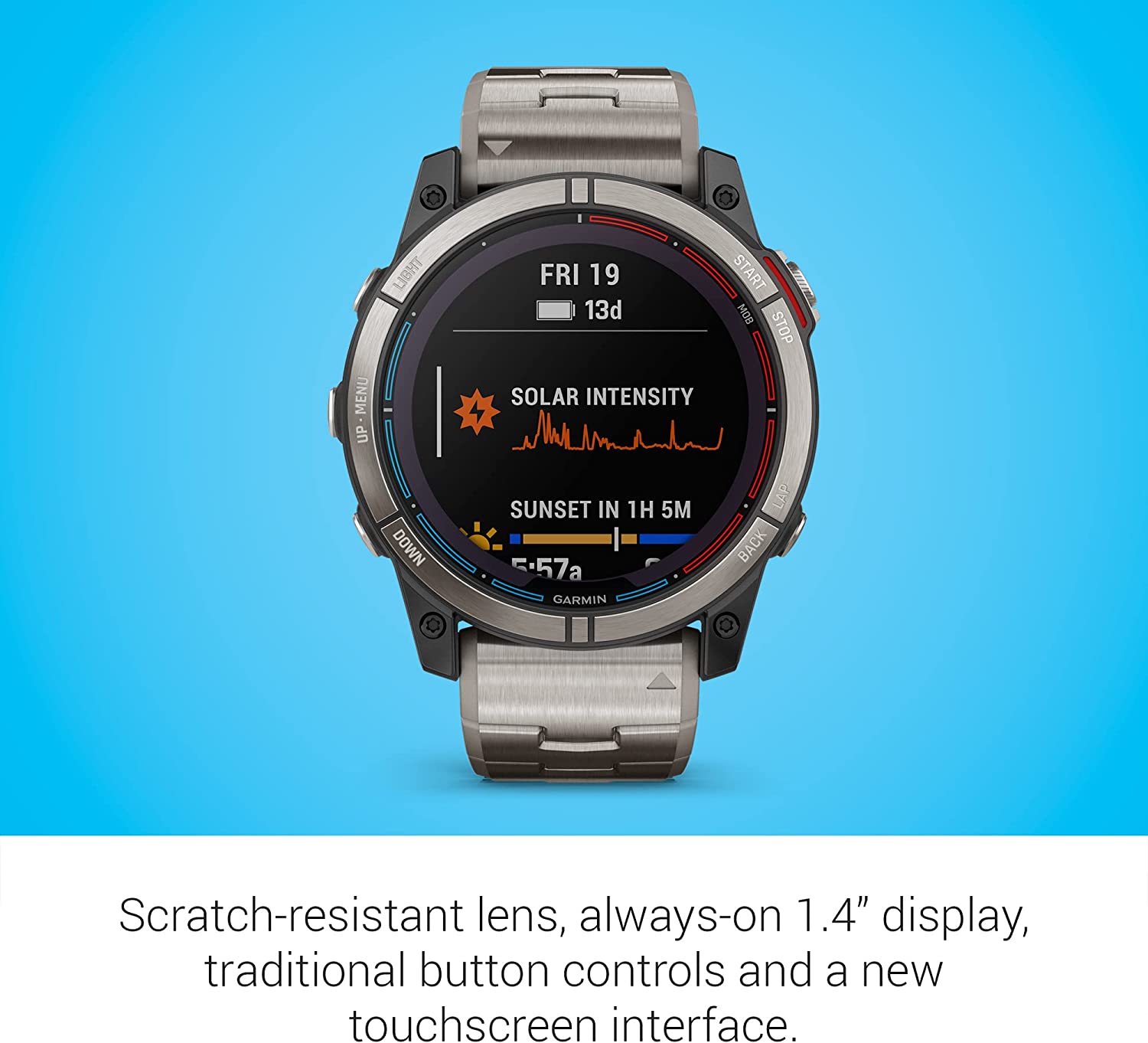 - Solar powered smartwatch with scratch-resistant Power Sapphire lens and always-on 1.4” display, diamond-like carbon coating, buttons, rear case and QuickFit band system