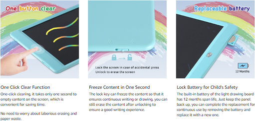 • Environmental-Friendly - The LCD Writing pad's battery can use 6 months (battery included). if the battery is exhausted, it can be replaced, and without charge or plug-in power, and the writing tablet can be reused 100000 times, and the stylus of girls toys can be hung on the writing board through the lanyard, you don’t need to worry about the stylus disappear and reduce the money of paper.