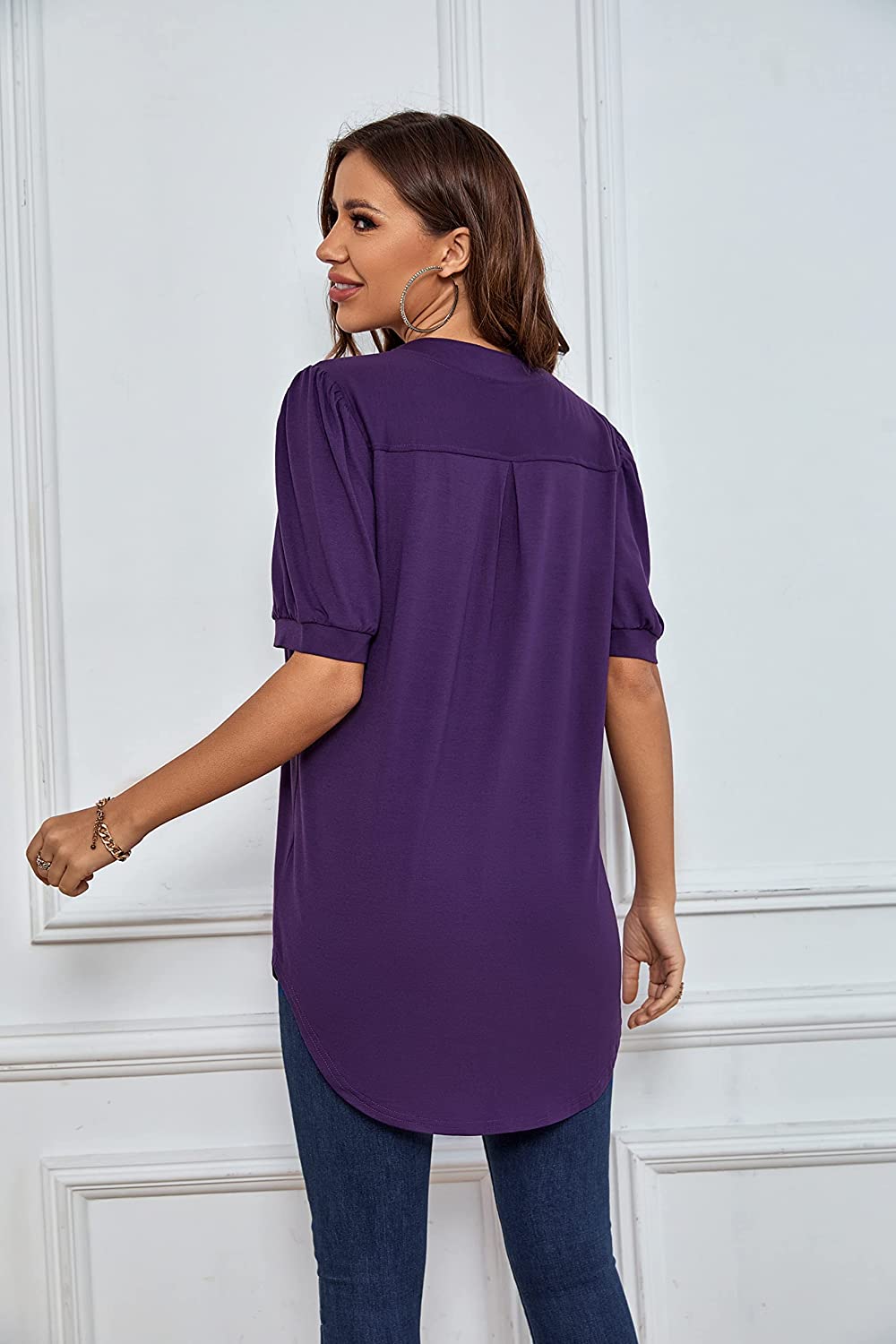 This shirt also features a v-neckline, cute collar detail, roll up 3/4 sleeves, a rounded hemline, and a trendy high-low cut! From the boardroom to the backyard, this beautiful tunic will have your heart all season long! Great choice for date, casual, daily life, work, vacation, outdoor, party, shopping.