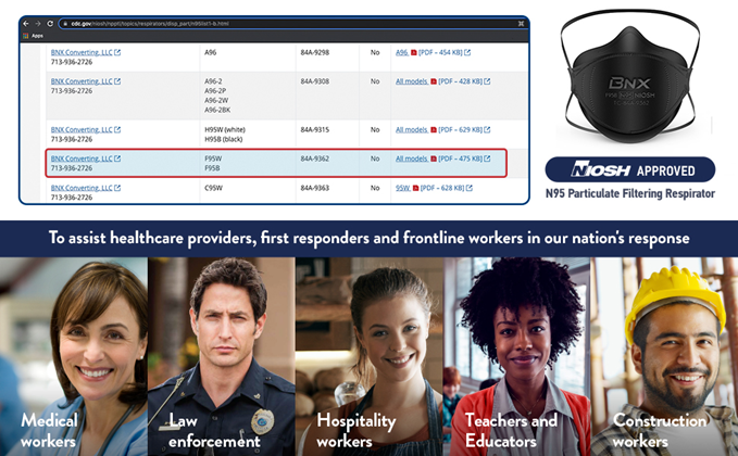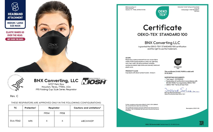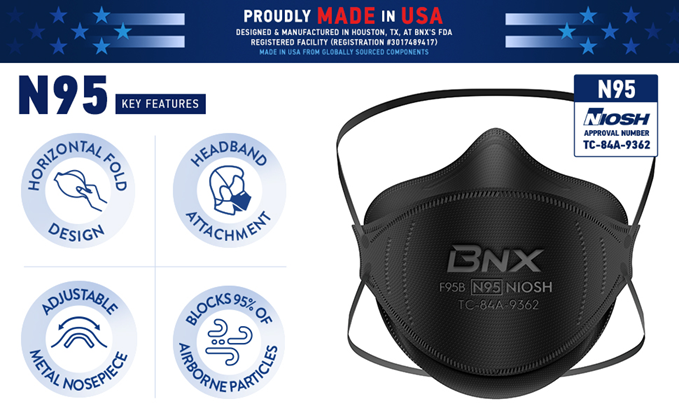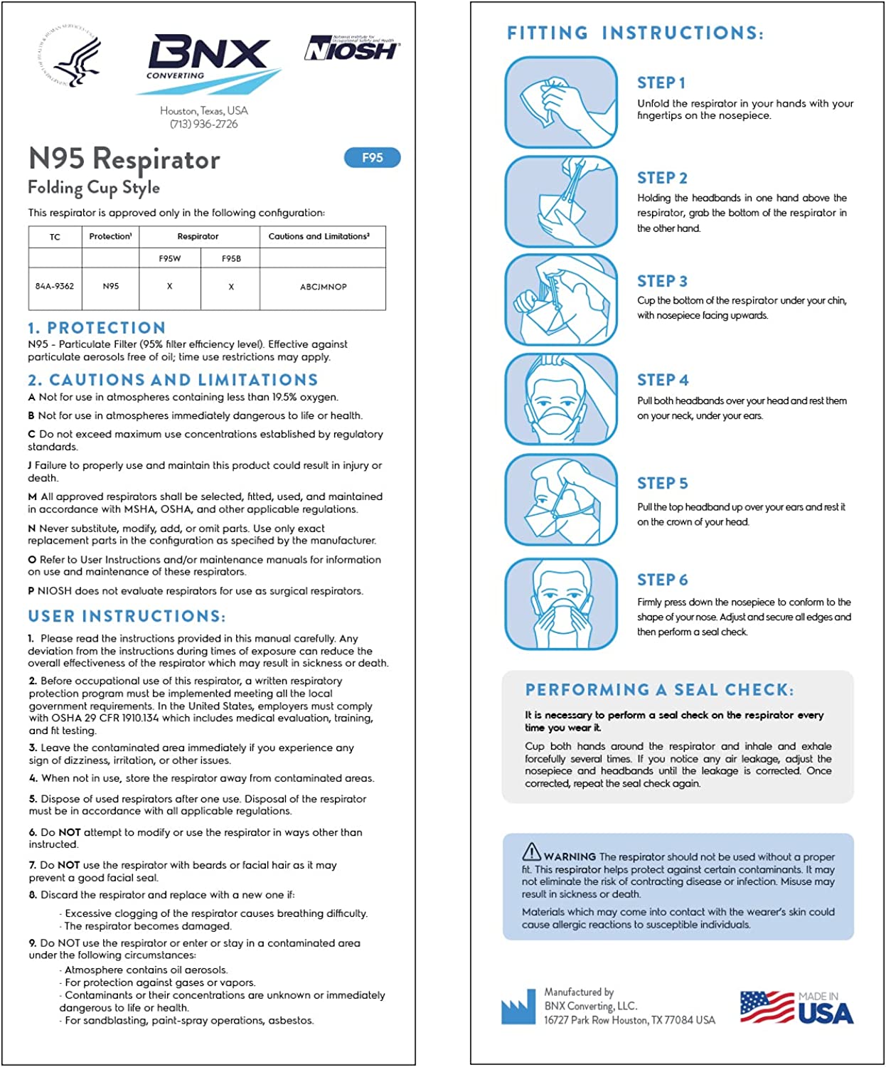 • MADE IN USA – Manufactured by BNX Converting LLC in Houston TX, a NIOSH/CDC Approved and FDA Registered (Registration # 3017489417) manufacturer of N95 mask respirators.