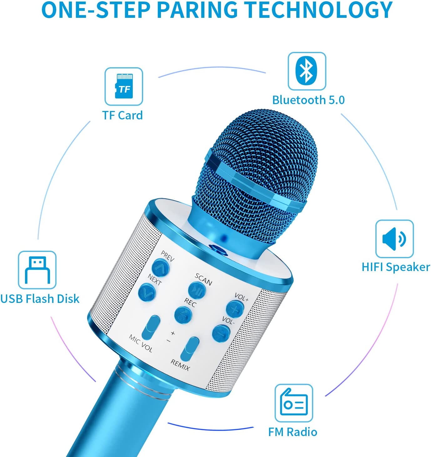 • 【Amazing Gifts】Beautiful appearance, comfortable feel, suitable for kids and adults. Perfect for KTV singing, gathering singing, family singing, travel singing, car stereo, instrument recording, interviews and live, etc. GIFTMIC Bluetooth microphone is a great gift to bring surprises and joy.