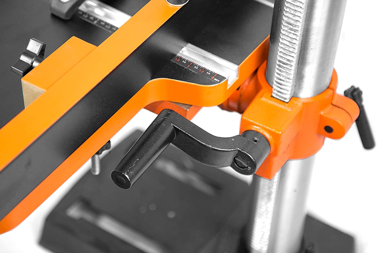 • Unique design provides clearance for the drill press’ table height adjustment crank