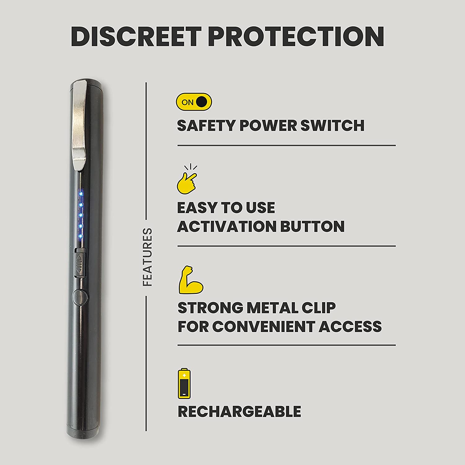 • Realistic Look: The pain pen stun gun looks like a normal pen so it is easily concealable for personal protection. Don't worry about losing it in a purse or backpack either - a strong metal clip will keep it right where you need it.