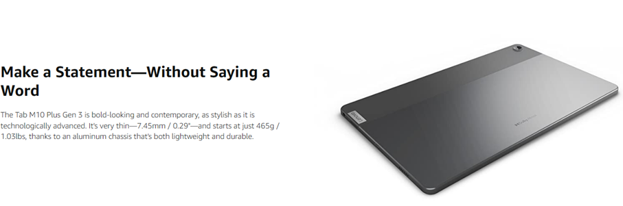 You can binge longer and study smarter with the Lenovo Tab M10 Plus 3rd Gen Android Tablet. Sleek, thin, and lightweight, this handy 10-inch tablet goes wherever you do, packing power and performance into a bold and contemporary aluminum chassis that's just 0.29" thin and as little as 1.03 lbs. Slip your Lenovo tablet into a shoulder bag, your school backpack, or carry it in folio case (available separately). The bright and colorful 10.6" display offers full HD clarity, so you can stream your favorite movies and shows for hours! Plus, with the special Reading Mode and TÜV Low Blue Light certification, you can enjoy long, comfortable hours of screen time on this Android tablet without straining your eyes. Music and audio sound great with the immersive quad speaker system optimized with Dolby Atmos®.This portable entertainment tablet is great for students, too, as you'll enjoy all-day performance with octa-core CPU and long battery life – including up to 12 hours of video playback time*. Take it with you wherever you go for reading, note-taking, streaming, and staying connected. With WiFi and Bluetooth® built in, you can watch your favorite movie, check your email, or have a video chat with friends or family from home or on the go.* All battery life claims are approximate and based on internal testing under optimal laboratory and network conditions. Actual battery performance will vary and depend on numerous factors including product configuration and usage, software, operating conditions, wireless functionality, power management settings, screen brightness and other factors. The maximum capacity of the battery will naturally decrease with time and usage.