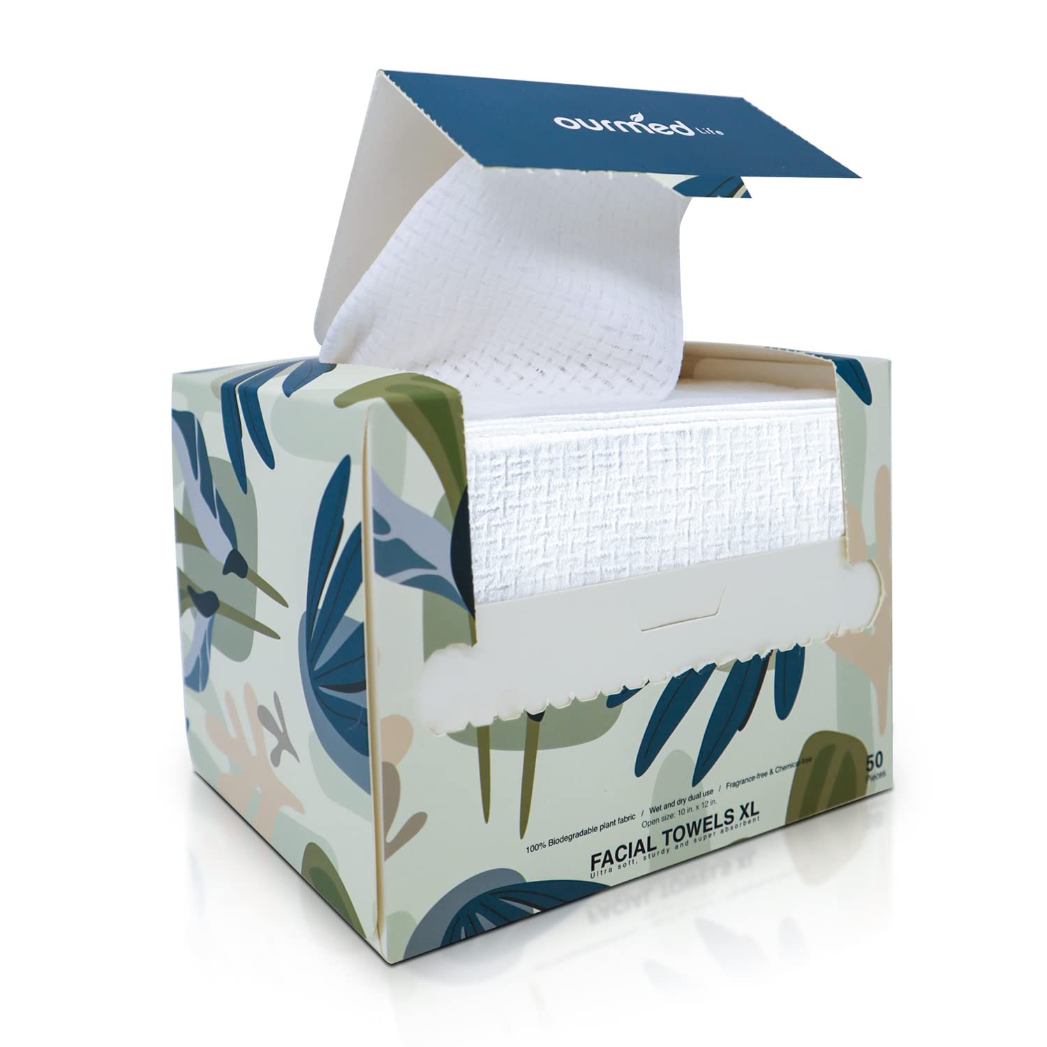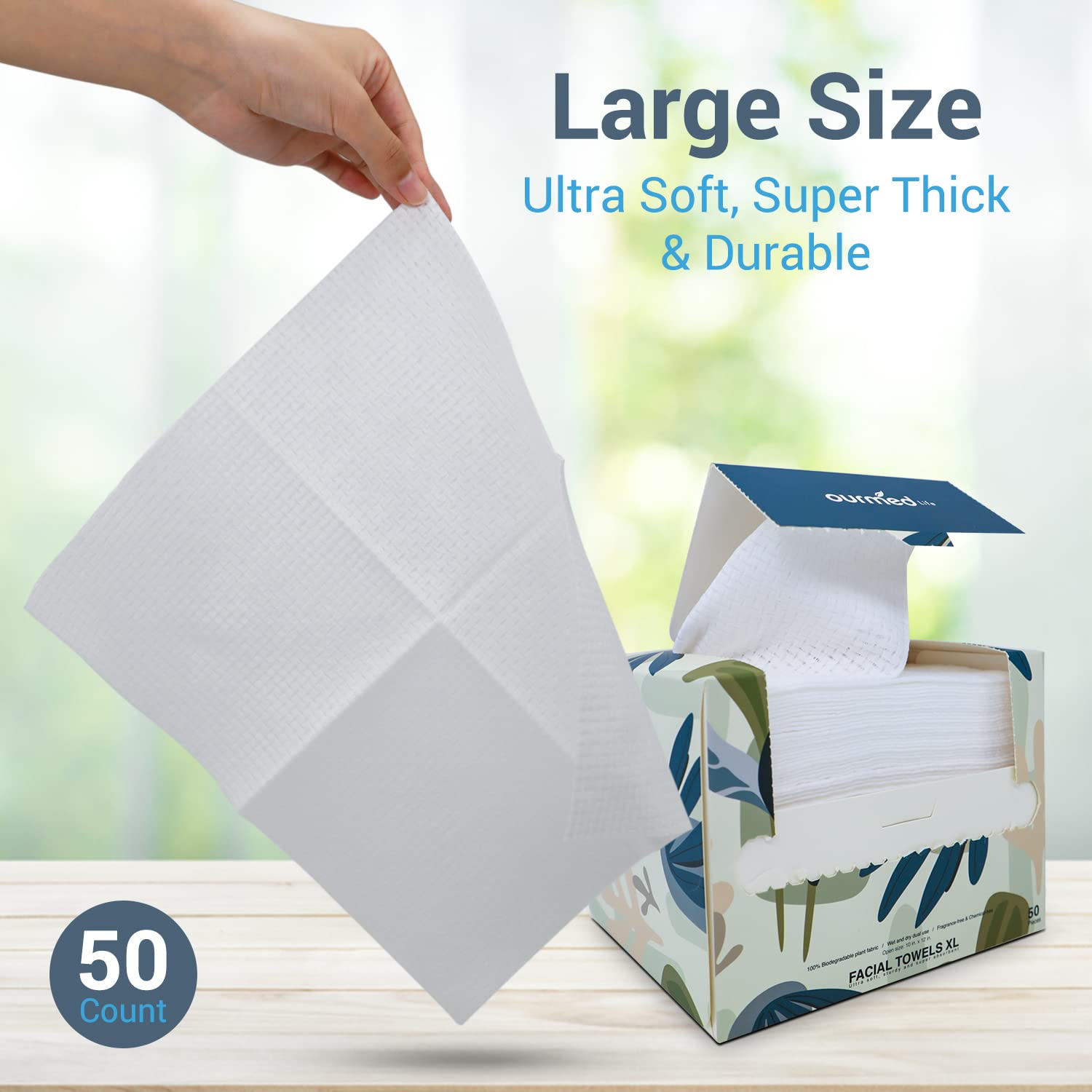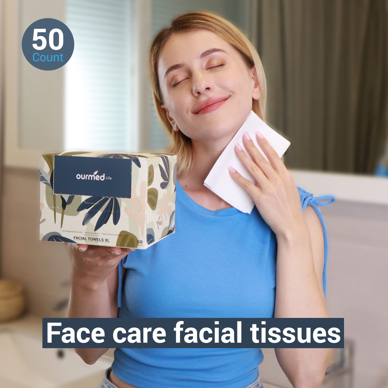 Ourmed Life Disposable Face Towel Facial Tissue | Lint-Free Biodegradable Clean Towels | Dry Makeup Remover Wipes | Super Soft & Thick for Sensitive Skin | 10-Inch X 12-Inch Large Size | 50 Count