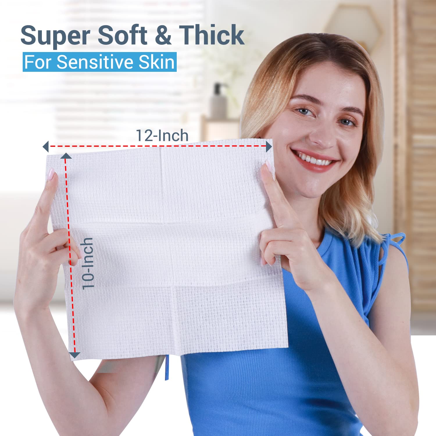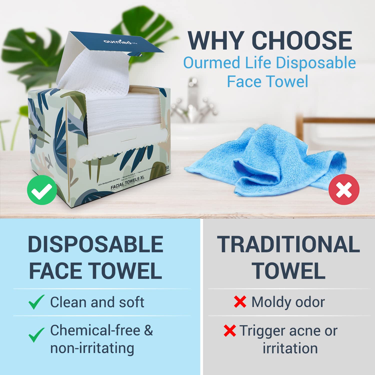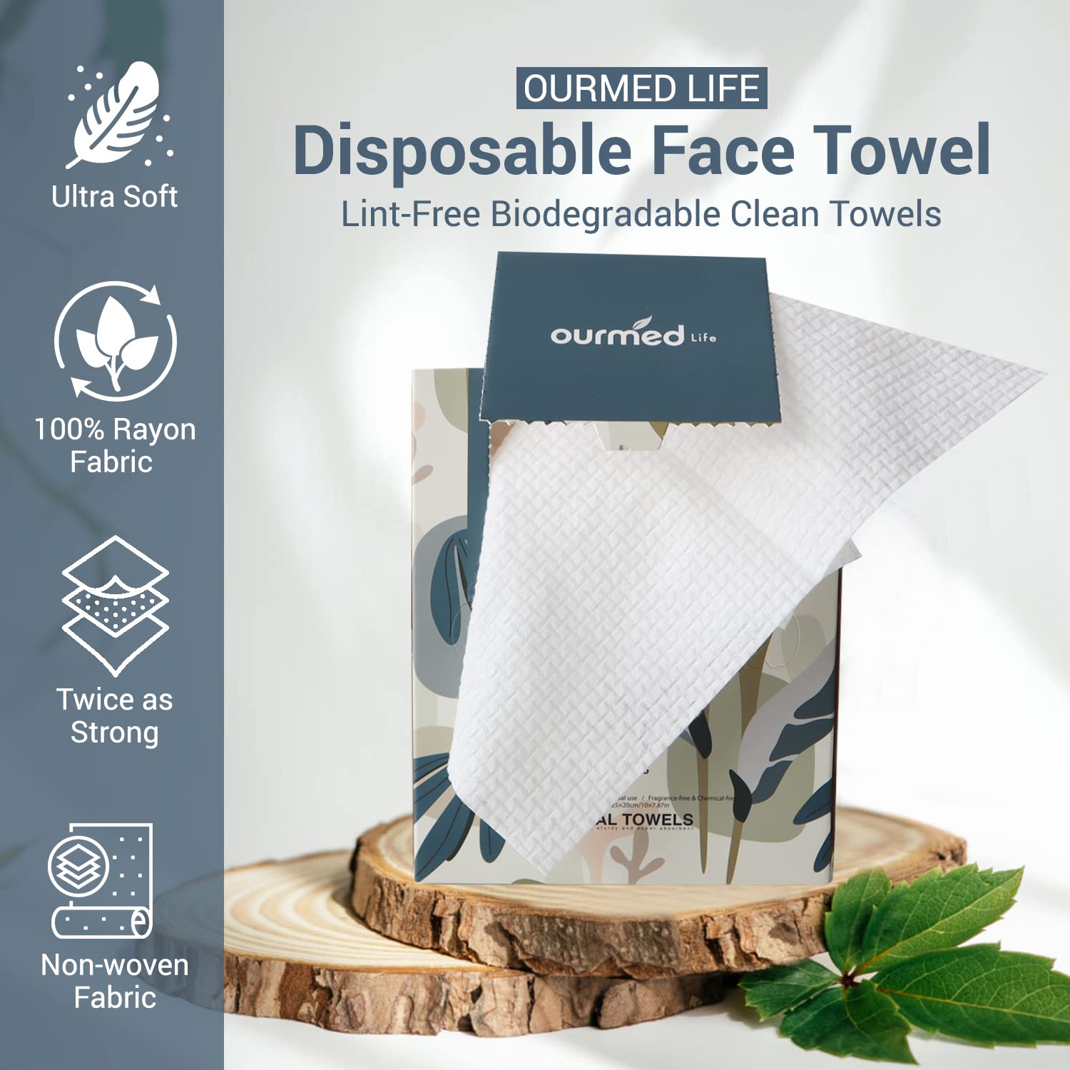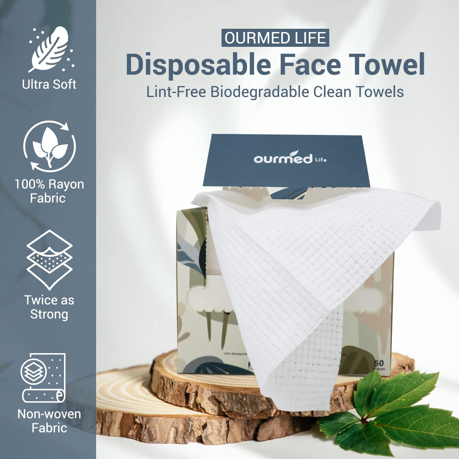 Ourmed Life Disposable Face Towel Facial Tissue | Lint-Free Biodegradable Clean Towels | Dry Makeup Remover Wipes | Super Soft & Thick for Sensitive Skin | 10-Inch X 12-Inch Large Size | 50 Count