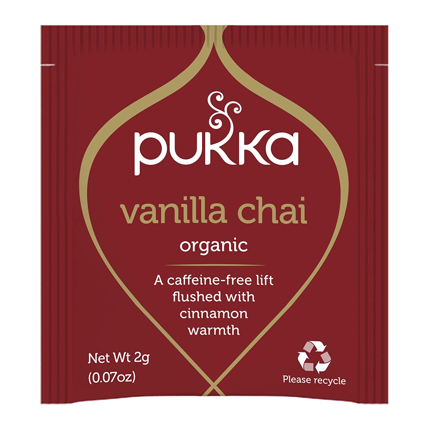 Pukka Organic Herbal Tea Vanilla Chai, a caffeine-free lift flushed with cinnamon warmth.