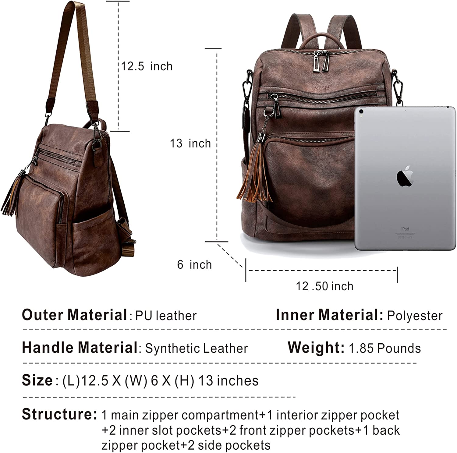 • 【Lightweight Backpack Bags 】 (L) 12.50 x (W) 6 x (H) 13 inches. Weight: 1.85 pounds. Adjustable back straps: 35.55"(longest size). Handle drop: 3.35". Detachable shoulder strap: 12.50". It's Slim & Lightweight ​for you to carry everywhere you want. You can also use it as a backpack, shoulder bag and handle for quickly carry.
