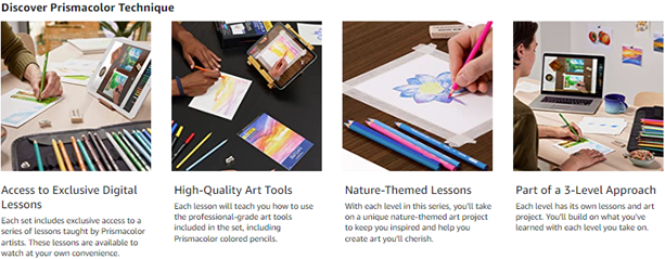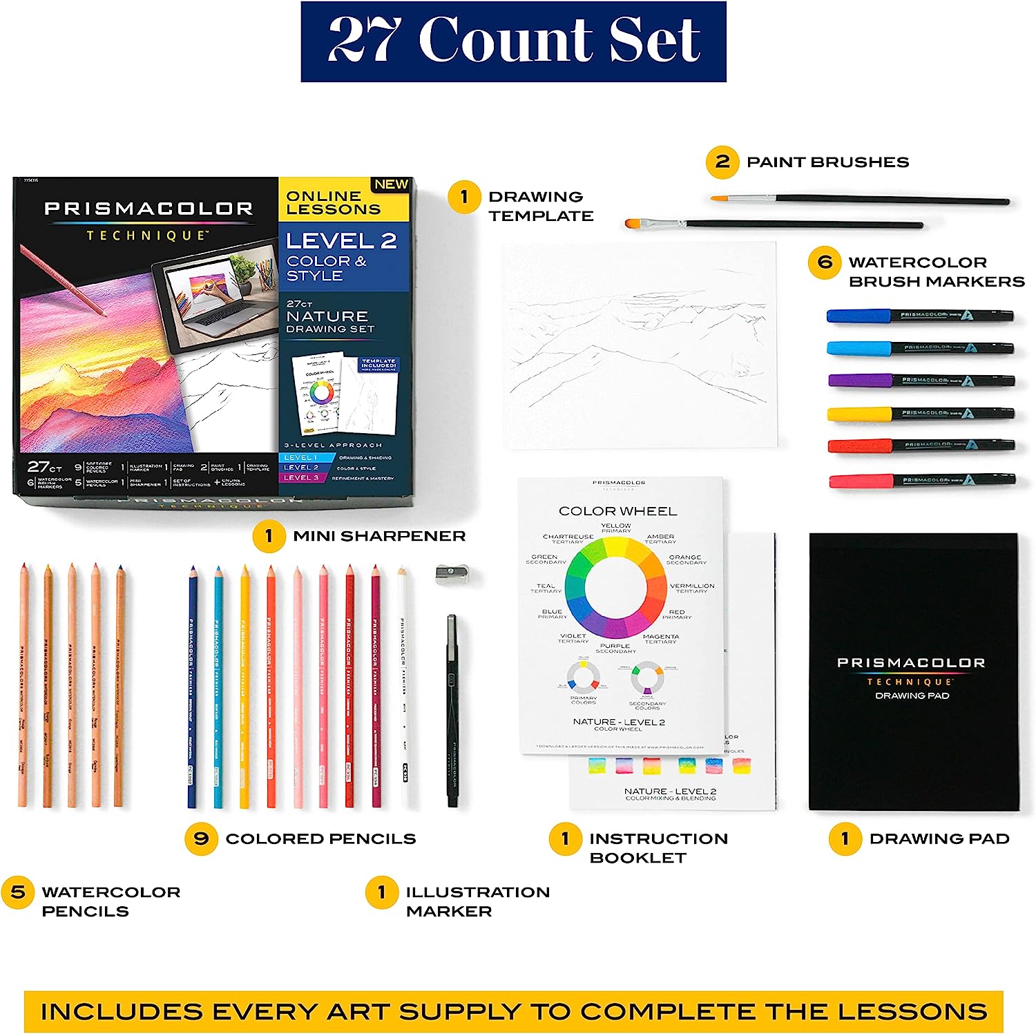 Learn art at your own pace from the comfort of home with Prismacolor Technique. Each Prismacolor Technique set features a unique coupon code for access to digital art lessons you can’t get anywhere else. Instructed by Prismacolor artists, each lesson will teach you how to use the professional-grade art supplies included in the set to create a piece of art you will cherish. The Level 2 Nature Drawing Set is designed for those who want to keep building on their art knowledge. You’ll practice color usage and style while creating a stunning sunset landscape. The set features Prismacolor colored pencils with rich cores for smooth color laydown, and watercolor pencils and brush markers that create brilliant watercolor effects. You’ll also receive brushes, an eraser, a drawing pad, a mini sharpener, a drawing template, a set of instructions, and hours of online content to learn at your convenience!