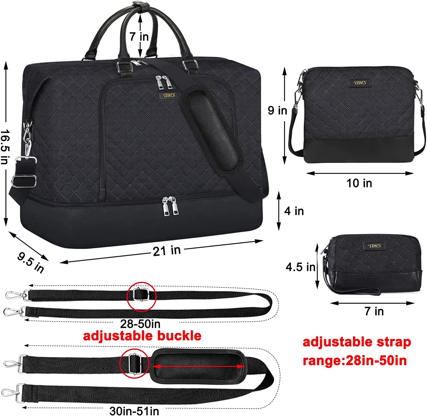 • Oversized Weekend Bag: Size: 21"L*9.5"W*16.5"H, (can hold up to 17 inch laptop and clothes for 3-5 days of short trips.Larger than normal travel duffel bag). Crossbody bag: 10"L×9"H. Toiletry bag: 7"L×4.5"H. Shoe Compartment: 21"Lx4"Dx9.5"W, can fit up to 2 pair of shoes. 2 Adjustable straps range: 25"-47".