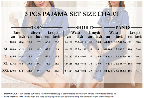3PCS PAJAMA SET FOR WOMEN: Women's silk satin pajamas set comes with comfy short sleeve pajamas shirt, silky shorts, a pair of drawstring elastic waist pants. Classic short sleeve silk pajama set, you can match this sleepwear in differnt way to meet your needs all year around.