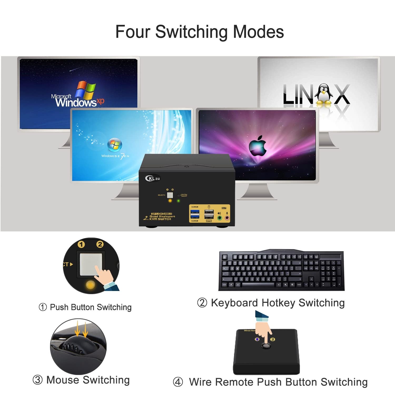 3. 8K KVM USB 3.0 Displayport: Support wired/wireless/unify/Bluetooth keyboard/mouse, Apple keyboard (hotkey is changeable), touch screen, OLED screen, 16:9 widescreen, 21:9 ultra-wide monitors, etc. (Bluetooth keyboard/mouse should with a receiver, it doesn't support built-in Bluetooth keyboard/mouse). support 3 display mode: extended display, mirror display and spliced display.