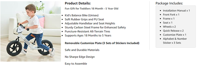 We developed the KRIDDO Balance Bike for ages 18 months to 5-years old to help young boys and girls learn about bike riding by pushing themselves along and gliding without relying on pedals. Fun and easy to use on all types of terrain, these easy-push balancing bikes even come with a removable customize plate, kids can draw anything on it or make it their own plate with stickers.