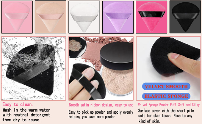 【Advantages Of Velvet Triangle Powder Puff】These Cosmetic Makeup Puff Tools Are Designed With Short Plush And Strap, The Short Plush Could Help To Save Your Foundation, It Will Not Get Too Much Powder And Meanwhile It Will Spread Evenly Over The Area, And The Strap Design Could Allow You To Steadily Hold This Makeup Puff Without Sliding Or Falling Off