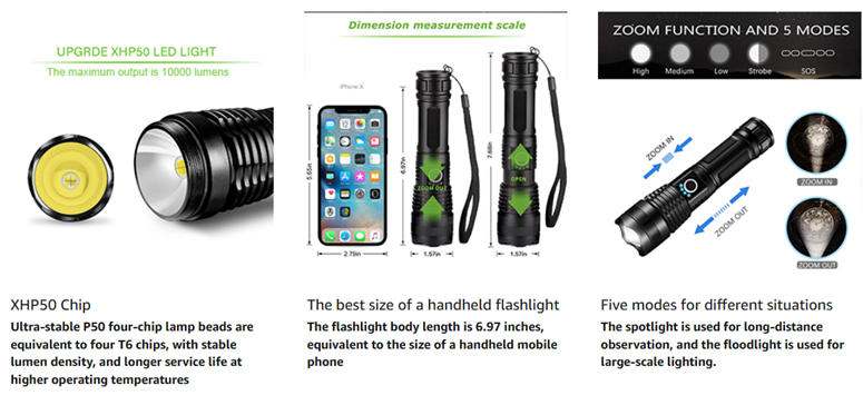 • [Function] The three adjustment methods of tactical flashlight can be adjusted according to different situations (just rotate the flashlight to adjust the zoom). Spotlights are used for long-distance observation, and floodlights are used for large-scale lighting. Two flash modes: flash jump reminder, SOS emergency rescue.