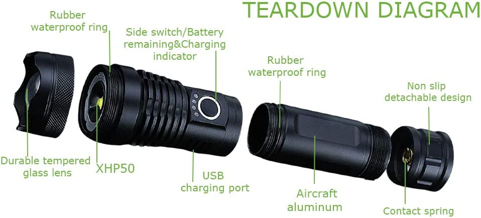 • [Brightness] For the first time, please remove the insulating sheet from the battery. The latest generation of XHP50 LED chip can produce ultra-high output of up to 10000 lumen, with a service life of up to 50,000 hours.The high-power flashlight will ensure high lumen output through heat dissipation, and temperature rise is a normal working state.If it does not work properly, please charge it for 1-2 hours.