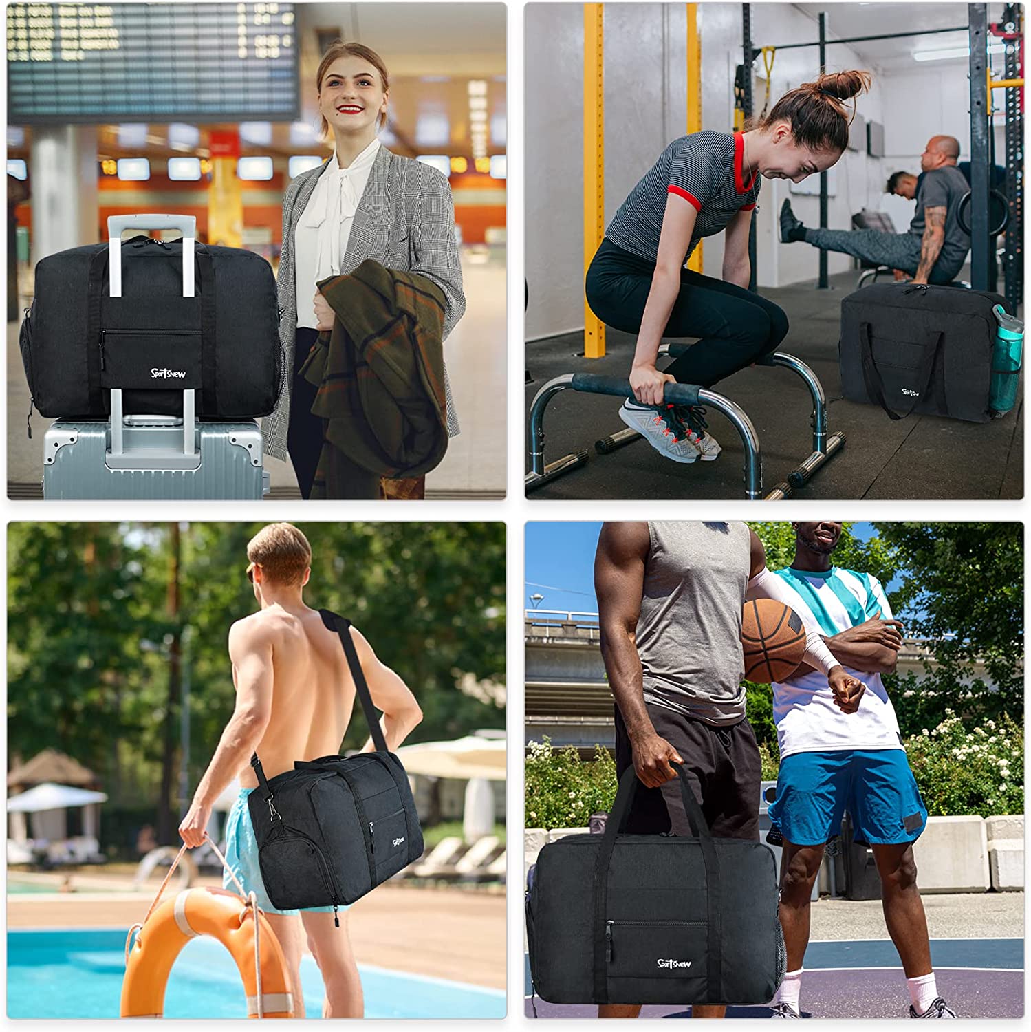 • 3 Carrying Options: over your shoulder, behind your back or by the bag's dual handles. You can use it as a sports gym bag, a carry on bag, a travel bag and a daily bag, perfect for workout, rides, gym, yoga, beach, pool, camping, practice days or weekend trips