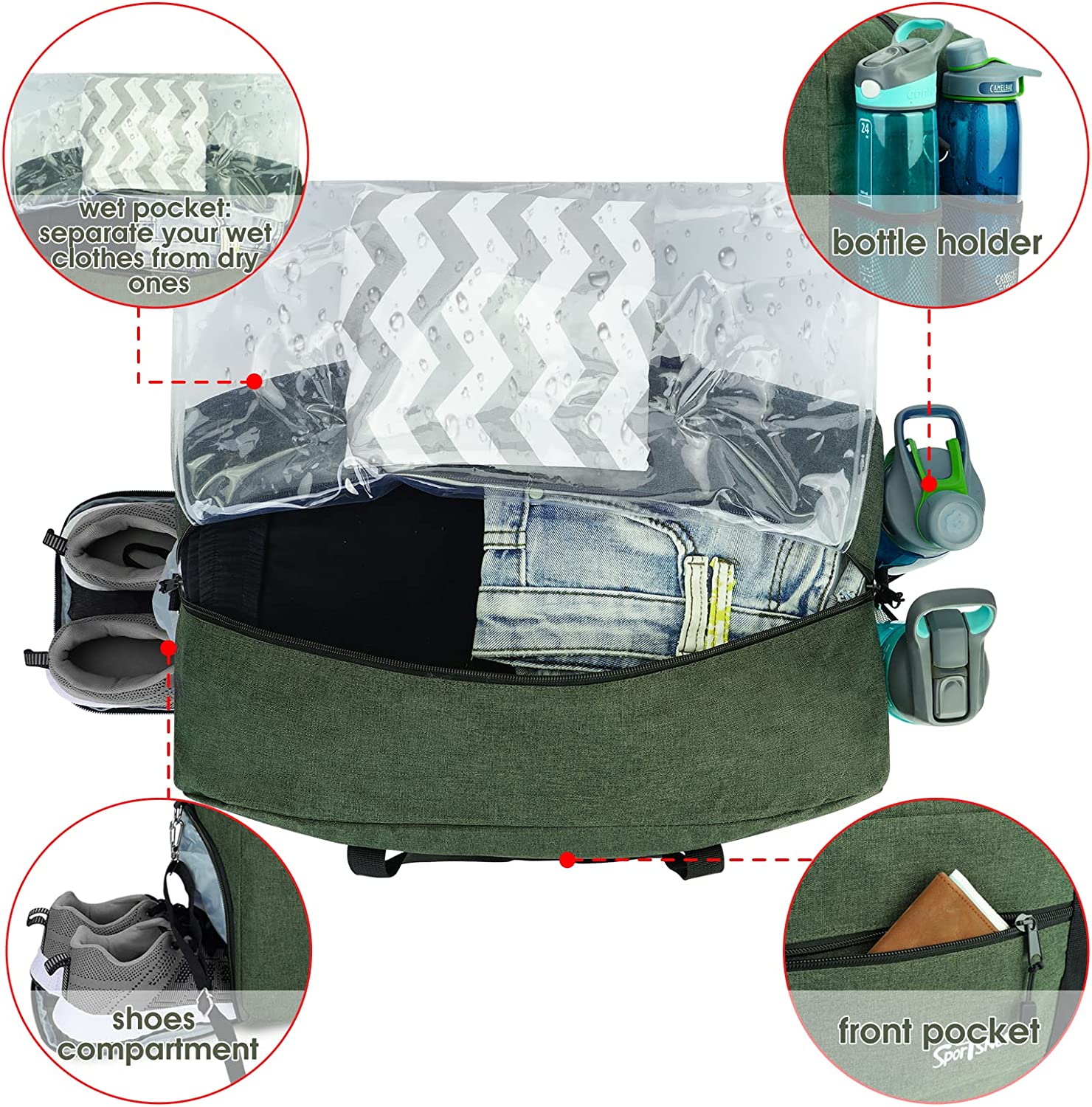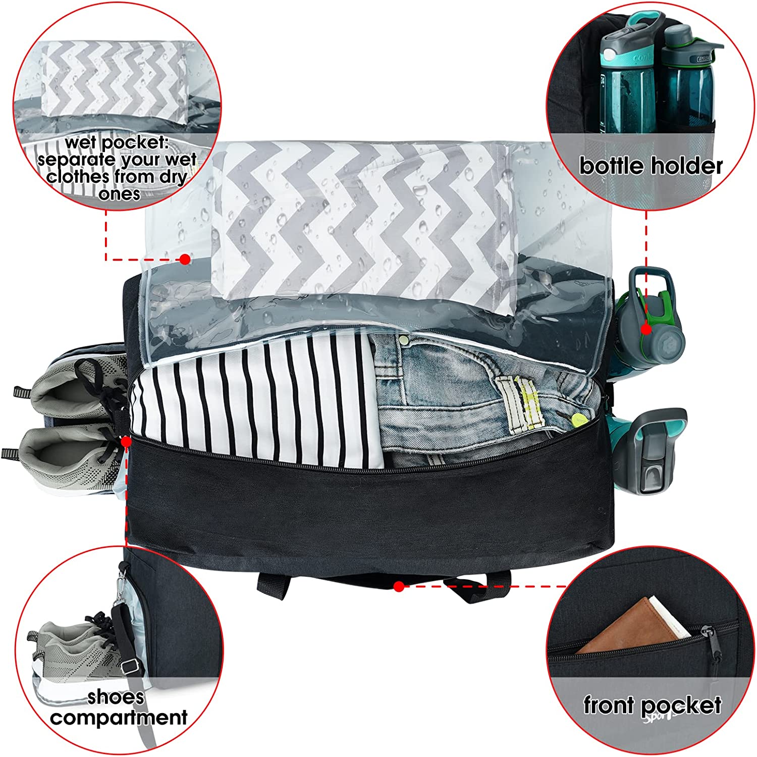 • Shoes & Water Bottle Pockets Design: This sports duffel features a separated zipper compartment on the left side for shoes, laundry or dirty gear storage. Two slip-in mesh pockets on the right side are each sized to fit a water bottle( 800ml)