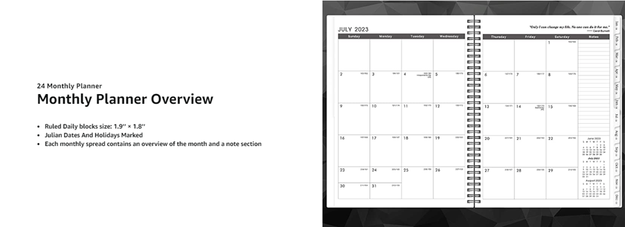 • ? 2023-2025 Monthly Planner - This July 2023 - June 2025 (9" x 11") classical monthly planner covers two years of monthly pages for a easier planning, scheduling and tracking. This monthly calendar can well improve your time management skill.