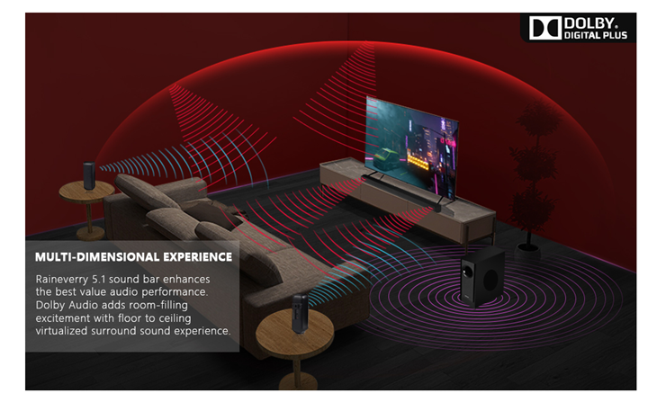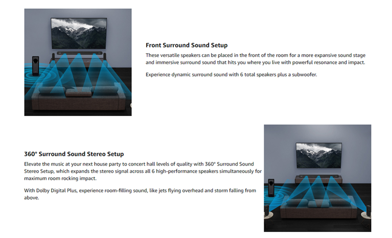 - 5.1-CHANNEL SURROUND SOUND EXPERIENCE - Fully enjoys the thrill of DOLBY DIGITAL PLUS with the newest 5.1 Surround sound Engine, DSP technology, and impressive 400W of total system power. Dolby Audio adds room-filling excitement with floor to ceiling virtualized surround sound experience. Immerse yourself with 360° room transforming sound that adapts to your environment with included wireless rear speakers, taking TV, movies, and music into a whole new dimension.