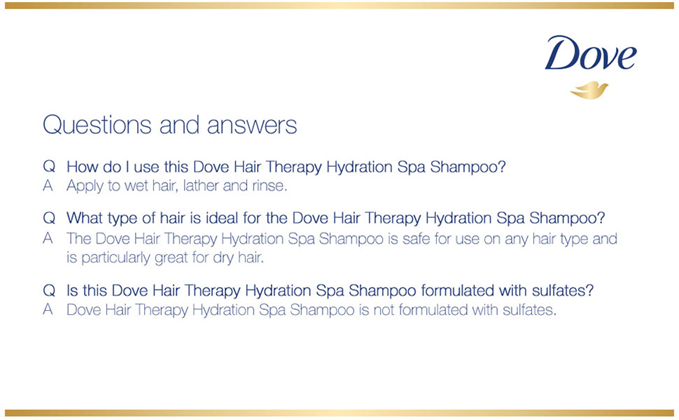 Wondering how to get soft, smooth hair? Shampoo plays a big part in how your hair looks and feels – and we’ve got just the thing. Treat your hair to a spa day from home and give it the nourishment it deserves with Dove Hair Therapy Hydration Spa Shampoo and Conditioner. Perfect for a dose of hair hydration, this hydrating shampoo for dry hair is formulated with hyaluronic serum to keep your hair feeling beautifully soft, smooth and nourished when used alongside our Hydration Spa Conditioner. And that’s not all, it leaves your scalp feeling refreshed, too. Specially created to care for your hair at a cellular level*, this moisturizing shampoo is made with potent moisturizers and nourishing ingredients. When used with our Hydration Spa Conditioner, it helps you give your hair the care it needs, exactly where it needs it. Plus, if you’re looking for a shampoo to moisturize hair, our 24-hour hydration lock does just that. Simply smooth it on and enjoy a spa-worthy treatment every time you shower. Perfect for: Expert hair care: Our Hydration Spa Shampoo works at your hair’s cellular level*, using expert care to keep hair moisturized. Formulated with hyaluronic serum and potent moisturizers, you’ll be left with hair that feels soft, smooth and nourished after just one wash, when used with our Hydration Spa Conditioner. Hair hydration: This hydrating shampoo uses 24-hour hydration lock technology to keep hair moisturized all day long, so dryness can become a thing of the past. A spa-like experience: Our Hydration Spa Shampoo blends expert care with the gentle Dove formulas you know and love to leave you with nourished, healthy-looking hair and a refreshed scalp – all from the comfort of your home. Cruelty-free hair care: Globally, Dove does not test on animals. Our Hair Therapy Hydration Spa range carries the PETA cruelty-free logo for added peace of mind. How to use: Enjoy this shampoo as part of your shower routine.