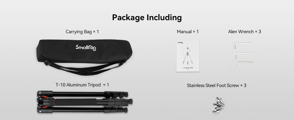 • Package Include: Tripod*1, Carry Bag*1, Alen Wrench*3, Maunual*1, Stainless Steel Foot Screw*3.