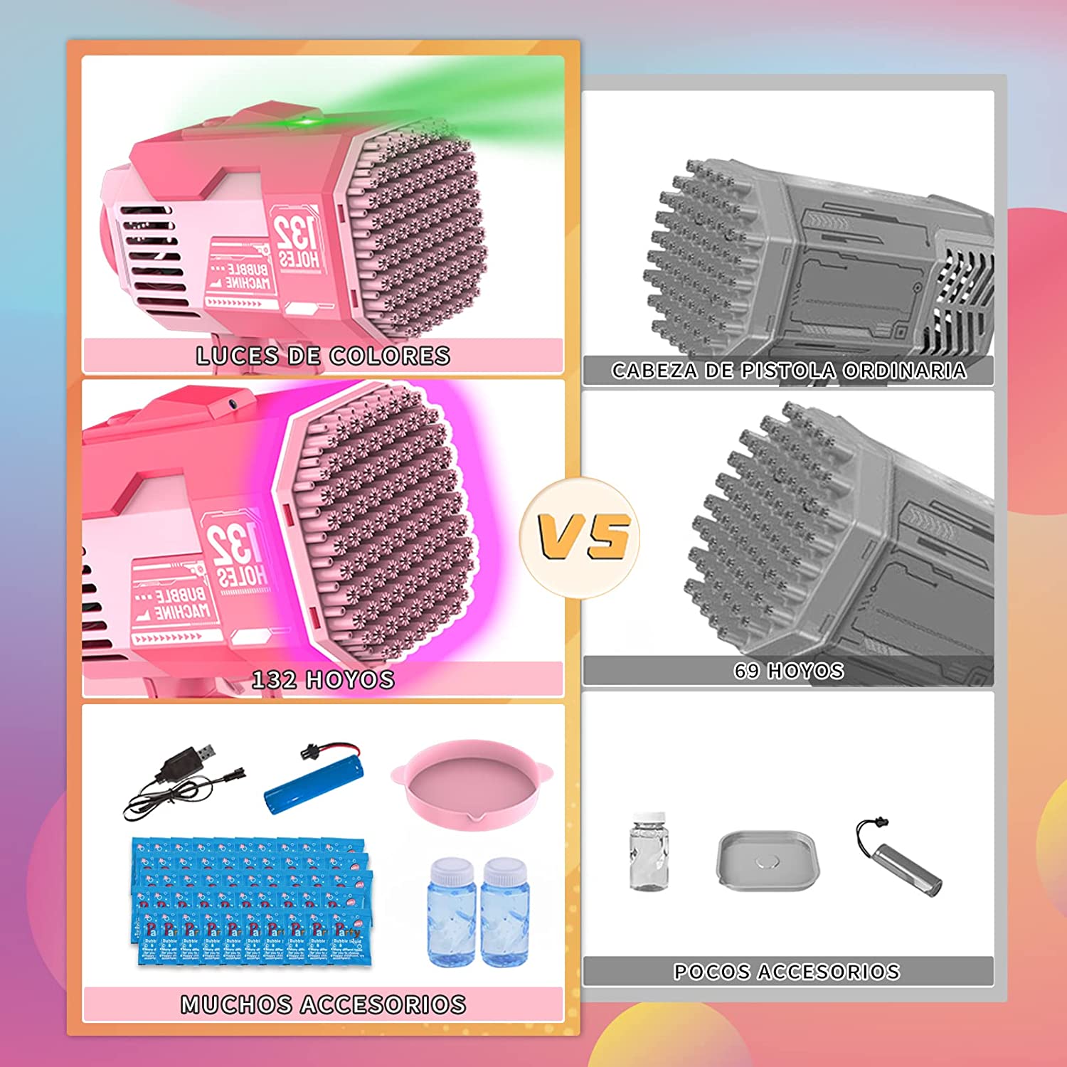 • 【Newly Upgraded 132-Hole Design】- The product includes a 132-hole Bubble Gun, two Bubble Liquid Bottles, 50 concentrated Bubble liquid packets, one sticker, one bubble tray, a rechargeable battery, and a charger. The tray is easy to clean and won't stick to your hands.