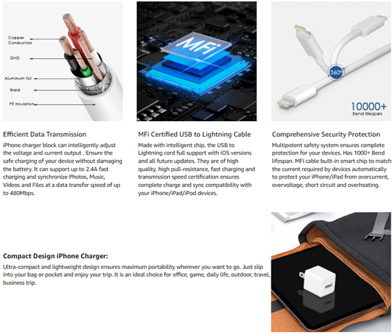 • 【Comprehensive Security Protection】: Multipotent safety system ensures complete protection for your devices. MFi cable built-in smart chip to match the current required by devices automatically to protect your iPhone/iPad from overcurrent, overvoltage, short circuit and overheating.