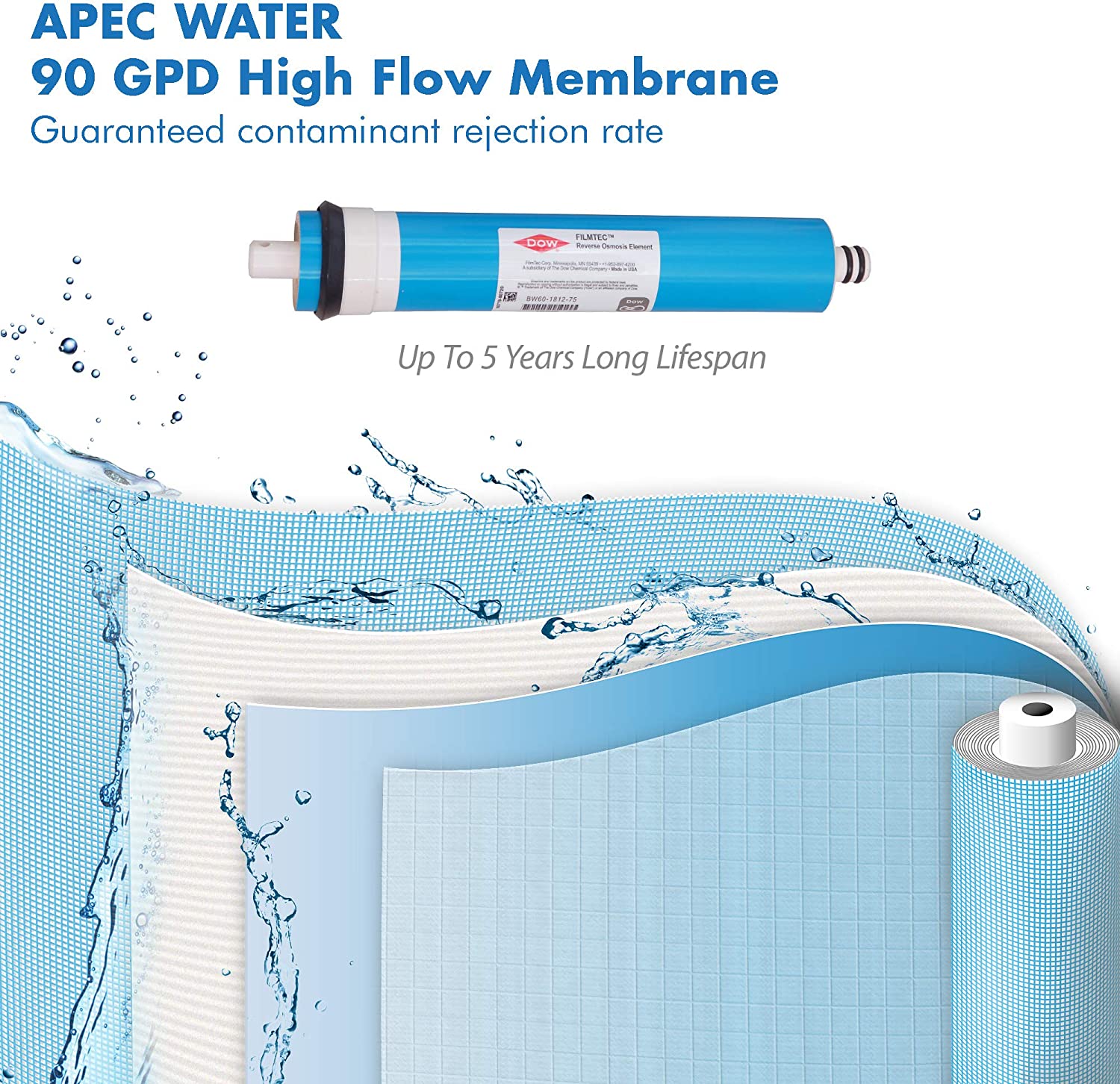 APEC Ultimate high flow 5-stage complete filter set is made in USA with the highest quality filtration components to provide a longer lasting filter set to protect and prolong the lifespan of your Reverse osmosis system. Premium quality pre-filter cartridges lasts over 12 months while the membrane and post carbon filter last 3-5 years for fewer filter change outs and high performance impurity removal. Compatible for APEC RO-90, RO-PERM, and all other standard size under counter 50-90 GPD RO systems on the market.