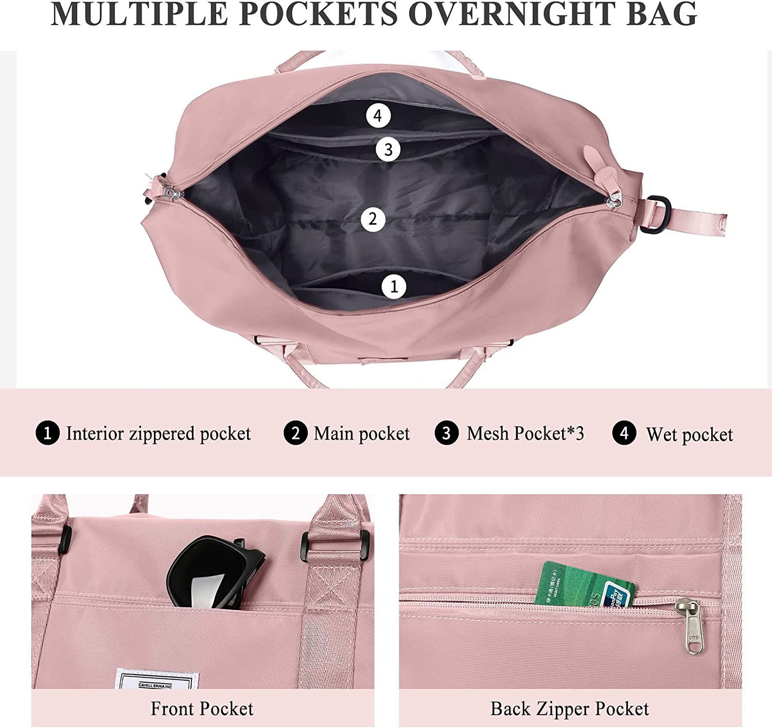 【Duffel Bag with Wet Pocket】This travel duffle bag for women comes with a wet compartment that way you can separate items in your bag. For example you go to the beach and want to change but your clothes are wet and you don't want to get everything else wet. Also if you have travel size toiletries that you are worried about leaking.