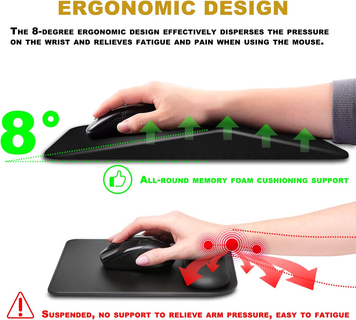 - ERGONOMIC DESIGN ? According to the structure of the human wrist, an ergonomic 8° inclination angle curve is designed to fit the wrist evenly and closely, reduce wrist pressure and avoid carpal tunnel pain.