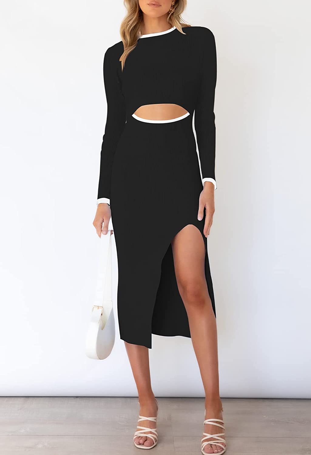 Cutiefox Women's Long Sleeve Cut Out Dress Side Slit Ribbed Knit Bodycon Midi Dresses